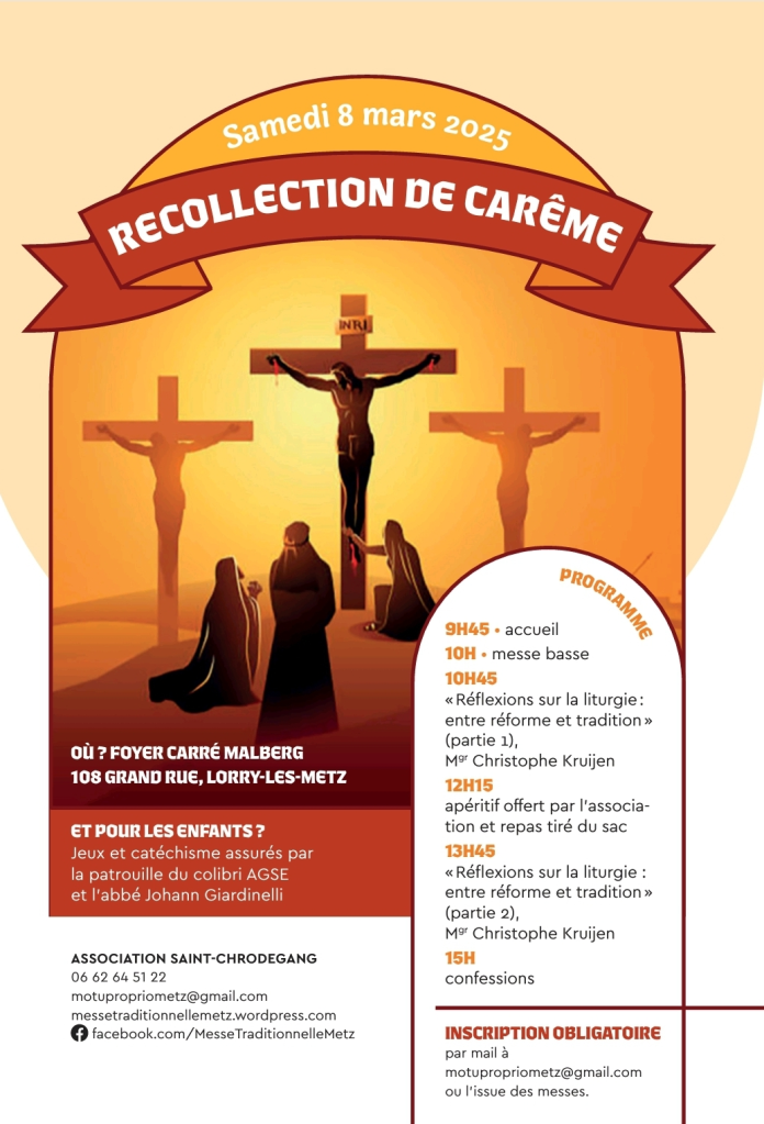Un lecteur nous invite à signaler la récollection de Carême qui sera prêchée ce samedi 8 mars par Mgr Kruijen, en charge de la communauté traditionnelle messine.
