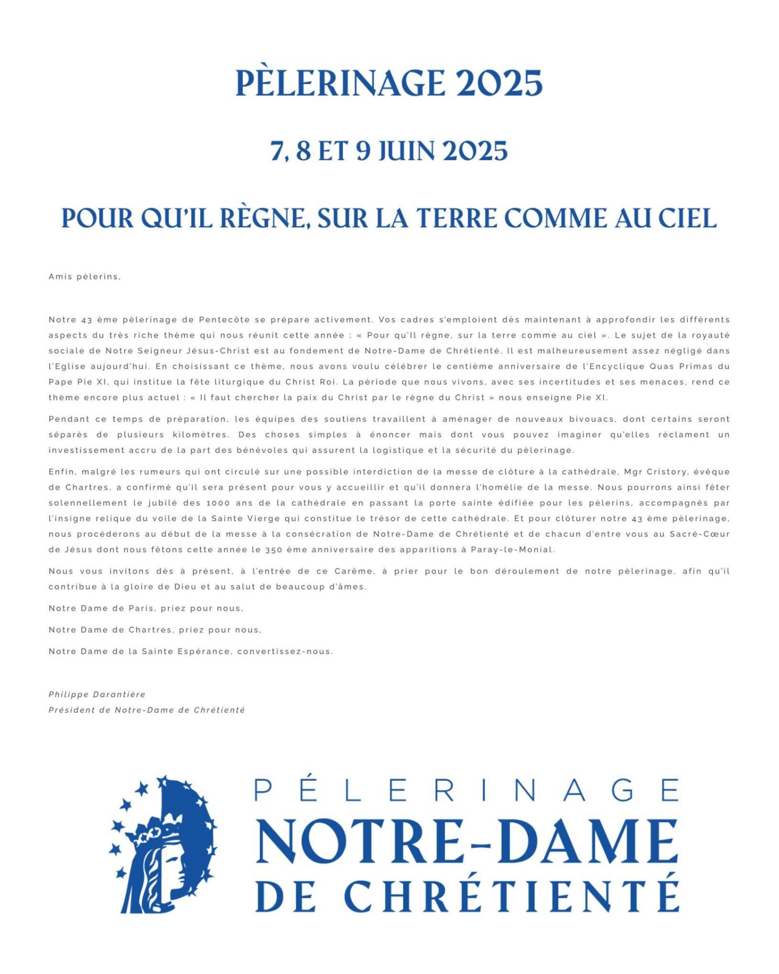 Enfin, malgré les rumeurs qui ont circulé sur une possible interdiction de la messe de clôture à la cathédrale, Mgr Christory, évêque de Chartres, a confirmé qu’il sera présent pour vous y accueillir et qu’il donnera l’homélie de la messe. Nous pourrons ainsi fêter solennellement le jubilé des 1000 ans de la cathédrale en passant la porte sainte édifiée pour les pèlerins, accompagnés par l’insigne relique du voile de la Sainte Vierge qui constitue le trésor de cette cathédrale. Et pour clôturer notre 43ème pèlerinage, nous procéderons au début de la messe à la consécration de Notre-Dame de Chrétienté et de chacun d’entre vous au Sacré-Cœur de Jésus dont nous fêtons cette année le 350ème anniversaire des apparitions à Paray-le-Monial.