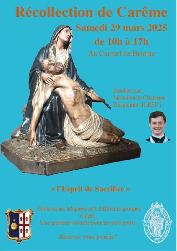 Accueil » Nos archives » Récollection de Carême à Beaune le 29 mars Summorum Pontificum Récollection de Carême à Beaune le 29 mars L’Institut du Christ Roi (Dijon) et la Fraternité Saint-Pierre (Chalons sur Saône) proposent une récollection de Carême au Carmel de Beaune (21) prêchée par le Chanoine Despaigne, ICRSP, le 29 mars : ICRSP – Dijon FSSP – Chalons sur Saône Article précédentL’humanité fait de mauvais choix depuis longtemps Article suivantConférence de Dom Louis-Marie de Geyer ce samedi 15 mars à Versailles 14 mars 2025