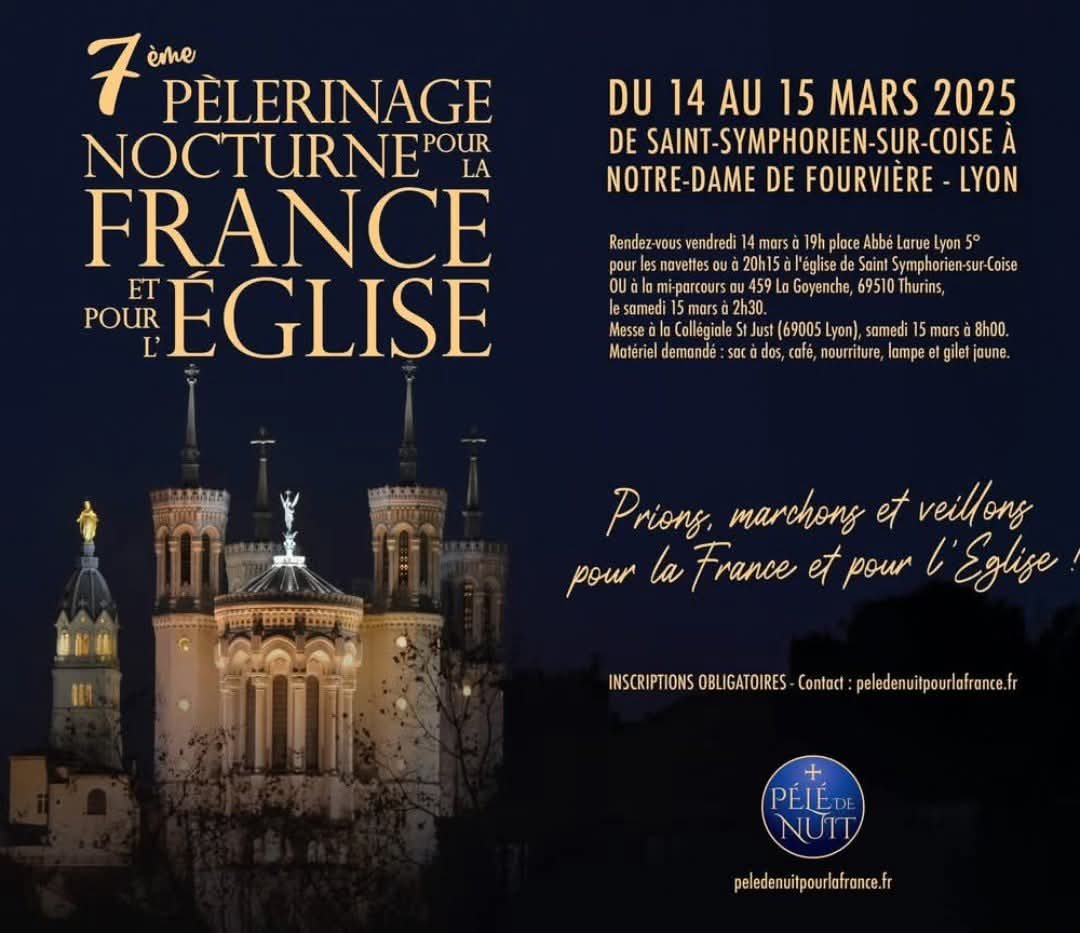 Le 7è Pèlerinage nocturne pour la France et pour l’Eglise jusqu’à Notre-Dame de Fourvière aura lieu dans la nuit du 14 au 15 mars 2025 de Saint Symphorien sur Coise à Notre-Dame de Fourvière (Lyon).