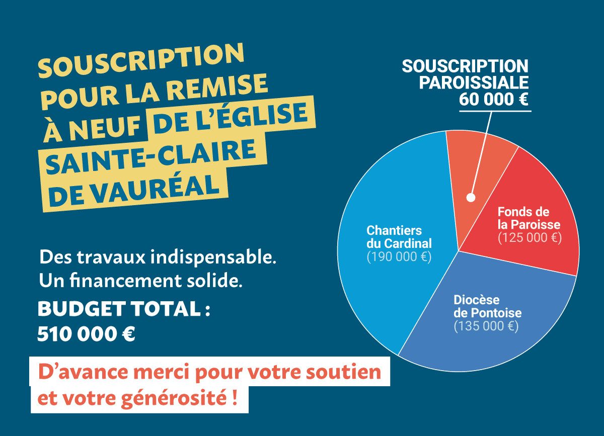 Les travaux indispensables, incluant les procédures strictes de désamiantage, s’élèvent à 510 000 €. Cette somme, notamment à la charge du diocèse et de notre paroisse, est un défi financier que nous ne pouvons relever sans votre aide. En vertu de la loi de 1905, l’église Sainte Claire ne fait pas partie du patrimoine communal, et nous devons donc compter sur la générosité de notre communauté. Notre paroisse doit réunir la somme de 60 000 €« .