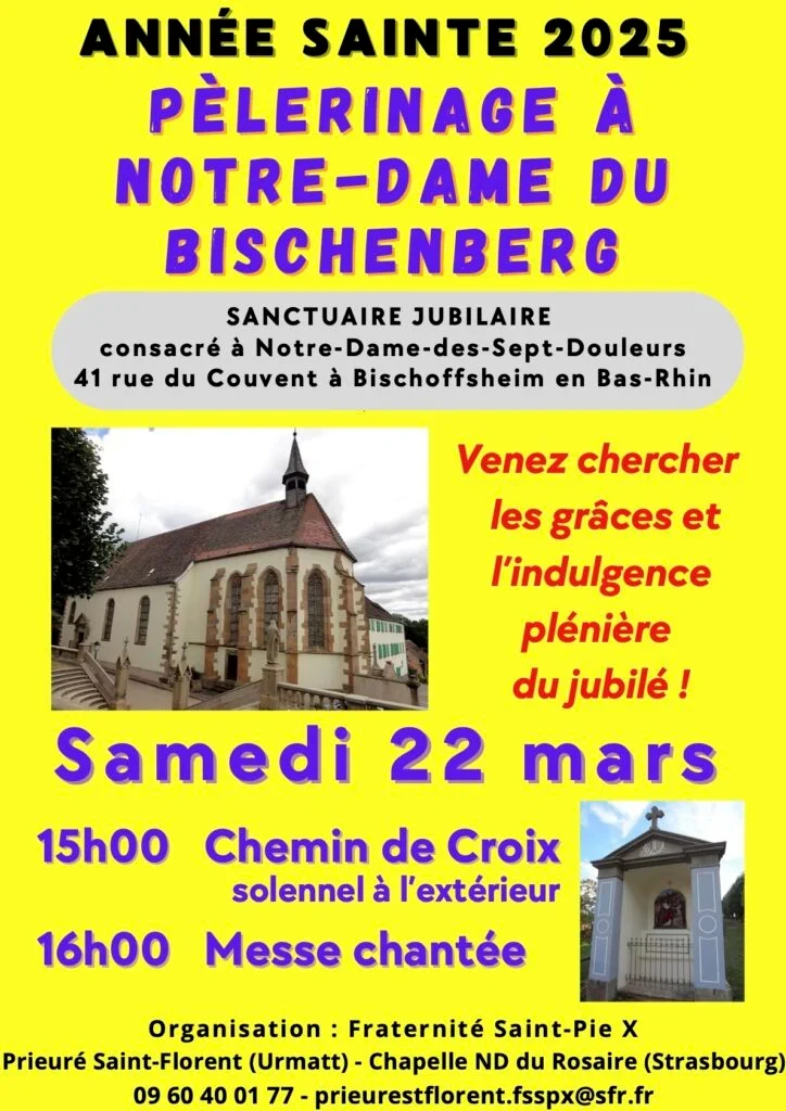 Accueil » Nos archives » Agenda : Pèlerinage à Notre-Dame du Bischenberg le 22 mars 2025 Summorum Pontificum Agenda : Pèlerinage à Notre-Dame du Bischenberg le 22 mars 2025 Le prieuré Saint-Florent (Urmatt) vous invite à un Pèlerinage à Notre-Dame du Bischenberg le samedi 22 mars. Aumônerie Fraternité Saint-Pie X. Article précédentLe pape François a concélébré à la polyclinique Gemelli Article suivantBraderie de Saint Joseph des Lys les 31 mars et 1er avril 16 mars 2025