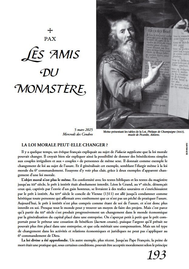 Il y a quelque temps, un évêque français expliquait au sujet de Fiducia supplicans que la loi morale pouvait changer. Il croyait bien sûr expliquer ainsi la possibilité de donner des bénédictions simples aux couples irréguliers et aux « couples » de personnes de même sexe. Il donnait comme exemple le changement de loi au sujet de l’usure. Et il généralisait cet exemple, semblant l’élargir même à la loi morale du 6e commandement. Essayons d’y voir plus clair, grâce à deux exemples d’apparent changement d’une loi morale.