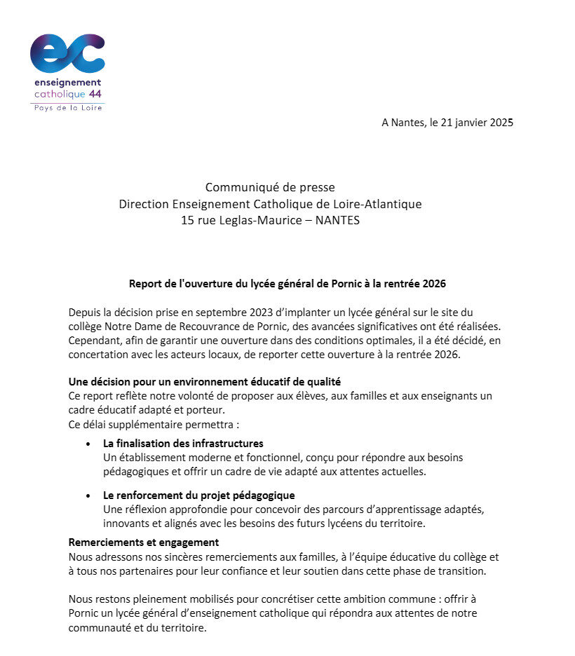 Le planning était peut-être un peu trop serré. L’enseignement catholique diocésain de Nantes avait annoncé en avril dernier l’ouverture d’un lycée sur le site de l’école et du collège à Pornic, au sud-ouest de la Loire-Atlantique, en pleine ville, dans des structures modulaires dans un premier temps, puis en ajoutant un bâtiment dans une des cours du site, et avec un objectif d’y scolariser 300 élèves. Finalement, l’ouverture est reportée d’un an.