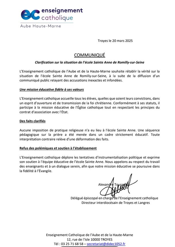 L’enseignement catholique de l’Aube a démenti sèchement les allégations de Reconquête : « Aucune imposition de pratique religieuse n’a eu lieu à l’école Sainte Anne. Une séquence pédagogique sur la prière a été menée dans un cadre strictement éducatif. Toute interprétation contraire relève d’une déformation des faits. L’Enseignement catholique déplore les tentatives d’instrumentalisation politique et exprime son soutien à l’équipe éducative de l’école Sainte Anne.« .