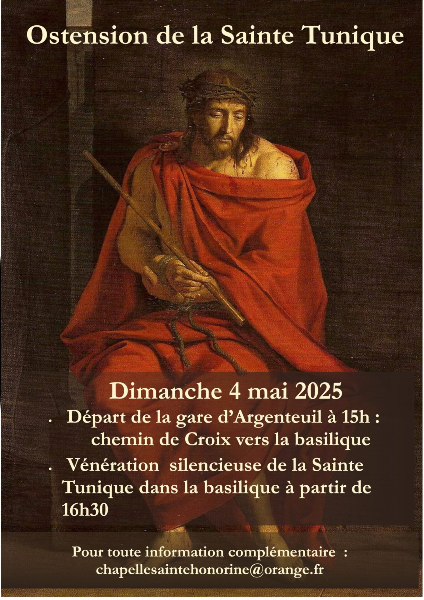 Une ostension de la Sainte Tunique du Christ est organisée par la basilique Saint-Denys à Argenteuil pour l’année 2025. A cette occasion, le prieuré Saint-Jean de Mantes-la-Jolie (FSSPX) organise un chemin de croix public dans les rues d’Argenteuil le dimanche 4 mai prochain selon le programme suivant :