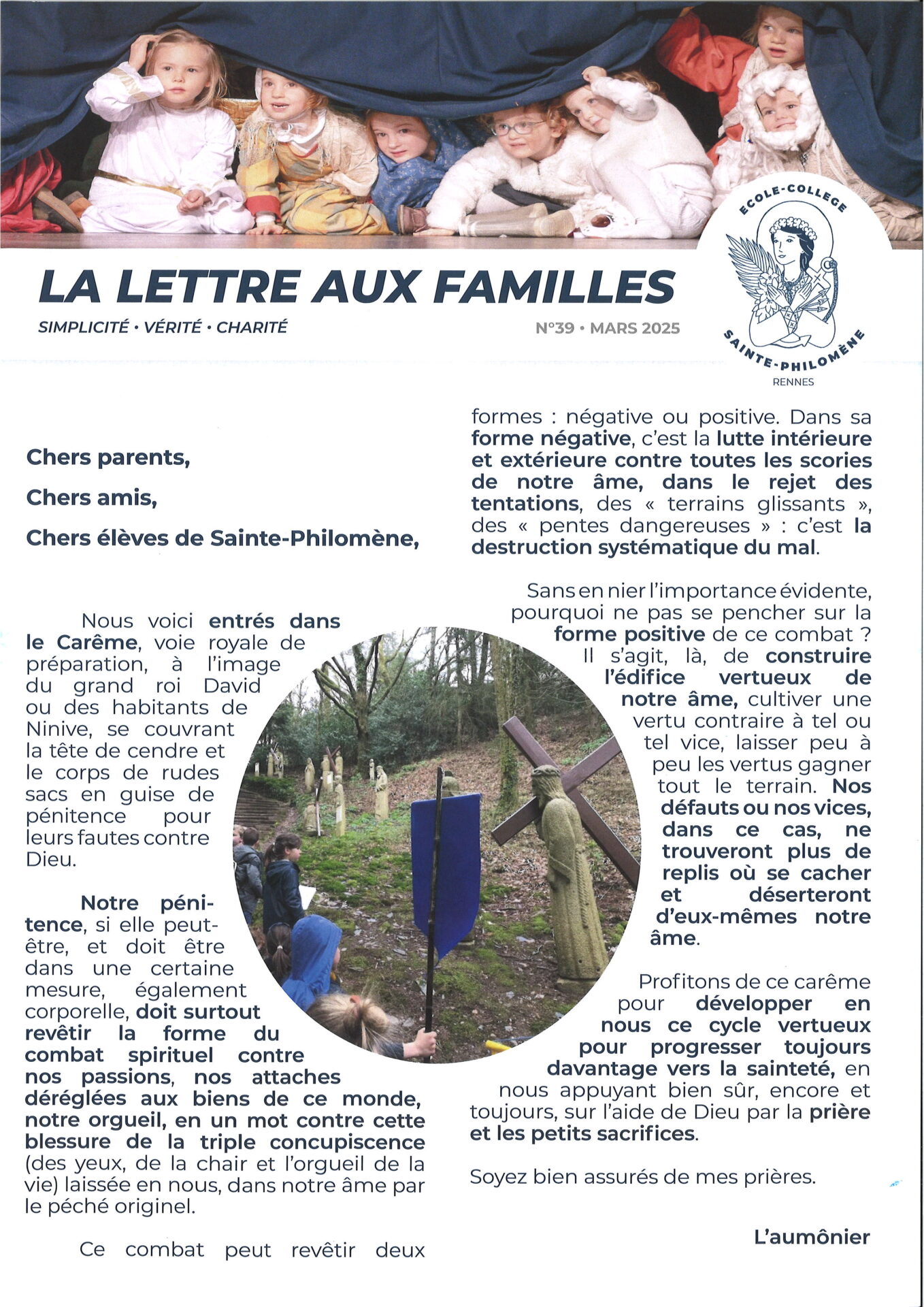 L’Ecole Saint-Philomène vient de publier sa dernière lettre aux familles (Mars 2025). L’aumônier de l’école évoque ce temps de Carême et la nécessité de progresser vers la Sainteté :