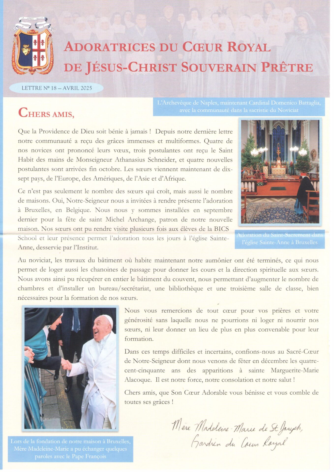 Accueil » Nos archives » Dernière lettre des Adoratrices du Coeur Royal (Avril 2025) Summorum Pontificum Dernière lettre des Adoratrices du Coeur Royal (Avril 2025) Les Adoratrices du Coeur Royal viennent de publier leur dernière lettre aux amis (n°18 – avril 2025). Les adoratrices ont reçu 4 nouvelles postulantes en octobre dernier, et 3 autres ont pris l’habit ces derniers mois. Adoratrice du Coeur Royal de Jésus-Christ Souverain Prêtre Article précédentLe pape a rencontré le vice-président américain Article suivantEmission Terres Mission (n°408, 20 avril 2025) 20 avril 2025