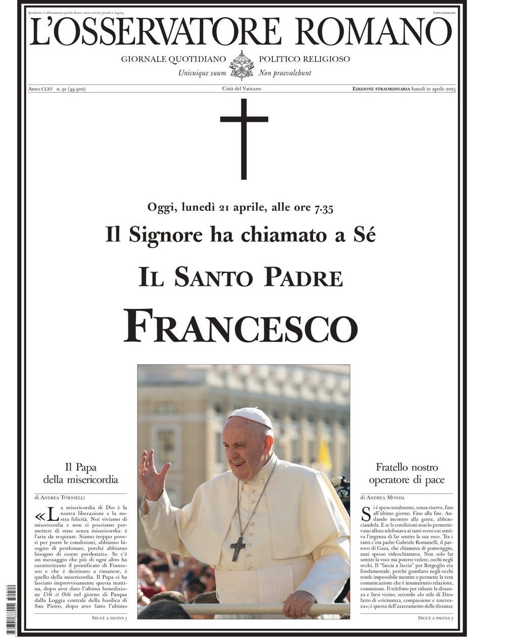 Accueil » Nos archives » La Une de L’Osservatore Romano Non classifié(e) La Une de L’Osservatore Romano Voici la Une de L’Osservatore Romano ce 21 avril 2025, quotidien du Vatican : Article précédentLes funérailles du pape auront lieu le samedi 26 avril à la place Saint-Pierre de Rome Article suivantMgr Macaire : comment faire fuir les jeunes de nos paroisses ? 22 avril 2025