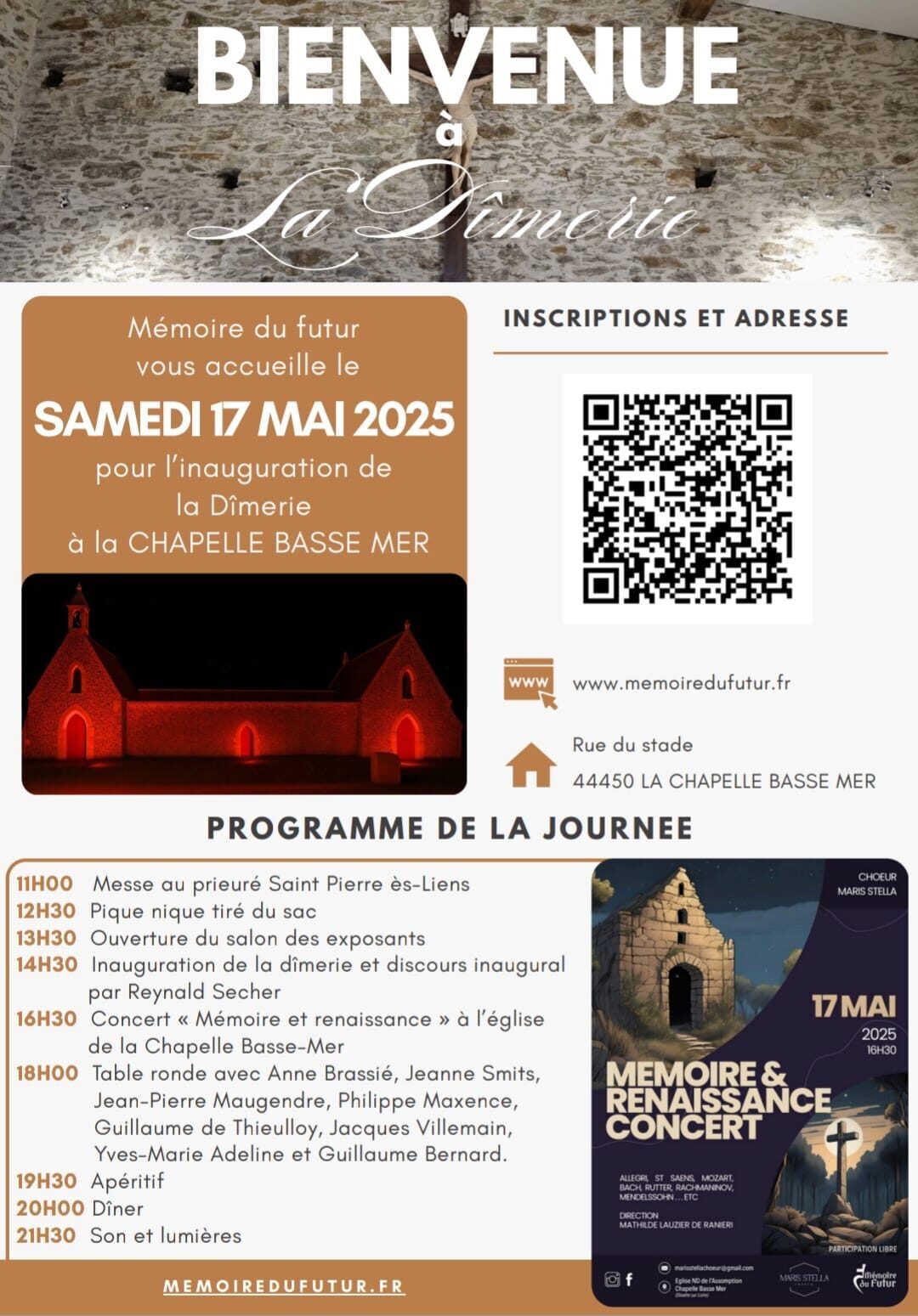 L’association Mémoire du Futur a l’honneur de vous convier le 17 mai prochain à l’inauguration de la dîmerie à la Chapelle Basse-Mer.