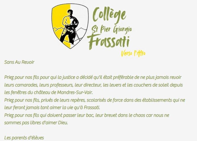 Le Collège-Lycée Frassatti avait été fondé en 2007 par des laïcs et comptait actuellement une quarantaine d’élèves. Sur le site de l’établissement, les parents d’élèves déplorent cette décision :