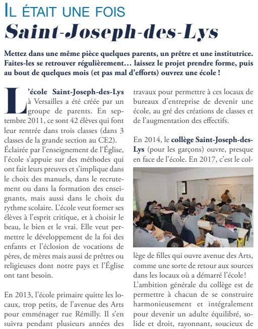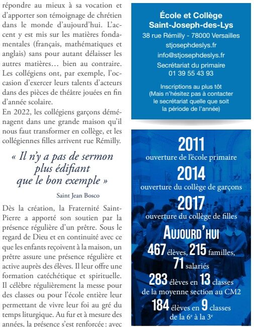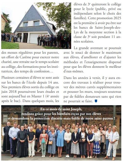 Dans ce numéro (n°49, Mars 2025), la Gazette de la Fondation Kephas présente l’Ecole et le Collège Saint-Joseph-des-Lys, école (mixte) et collège (non mixte) situés à Versailles et fondés par des parents en 2011. La Fraternité Saint-Pierre en assure l’aumônerie.