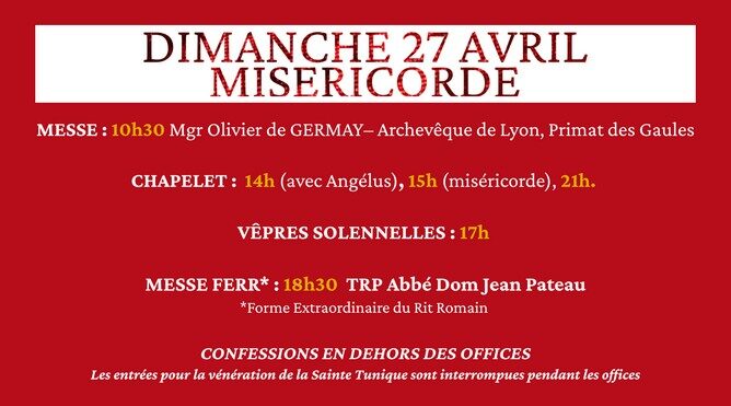 Dans le cadre de l’Ostension de la Sainte Tunique d’Argenteuil jusqu’au 11 mai, une messe dans la forme extraordinaire est célébrée ce dimanche 27 avril à 18h30 en la Basilique Saint-Denys à 18h30 par Dom Jean Pateau, père abbé de l’Abbaye Notre-Dame de Fontgombault.