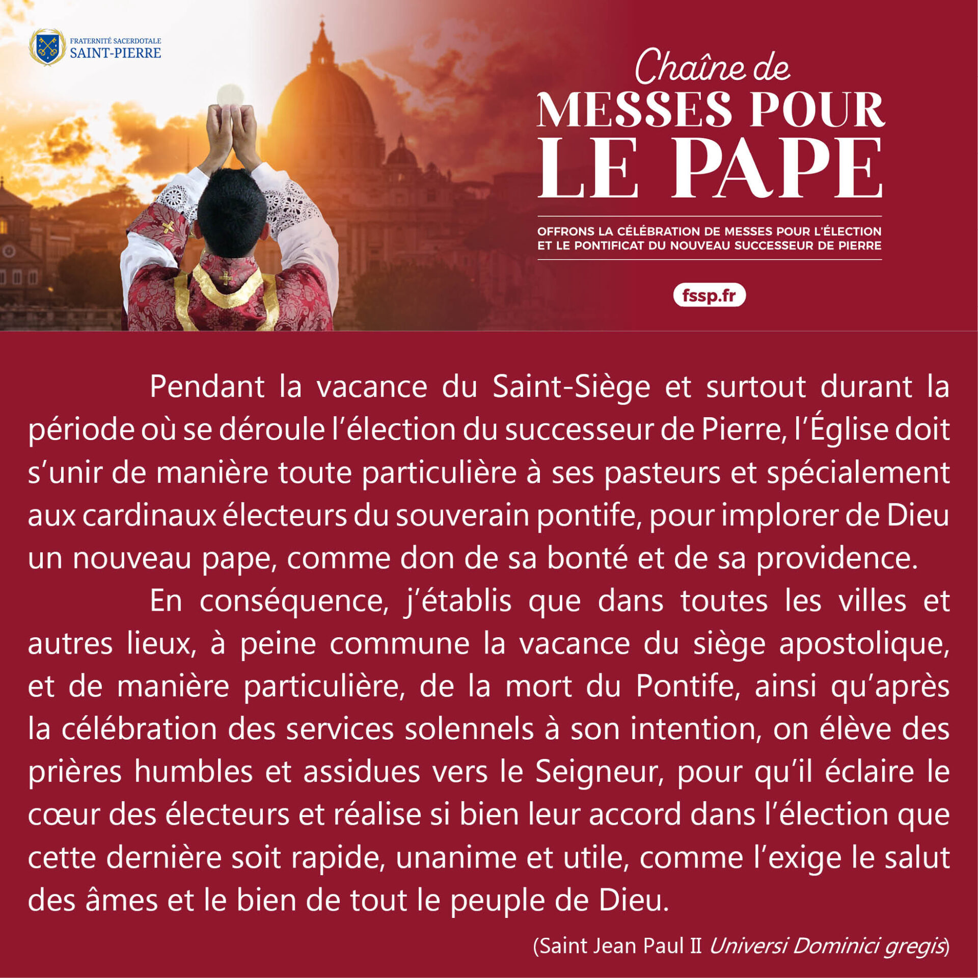 La Fraternité Saint-Pierre propose d’accompagner la vacance du Saint-Siège et le Conclave d’une prière intense pour l’élection du nouveau pape. Joignez-vous à la grande chaine de prière en offrant des messes pour le nouveau successeur de Pierre.