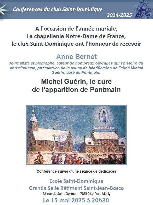 Un lecteur nous invite à annoncer cette conférence du Club Saint-Dominique (Le Pecq) et de la Chapellenie Notre-Dame de France (Port-Marly) d’Anne Bernet sur « Michel Guérin, le curé de l’apparition de Pontmain » le 15 mai.
