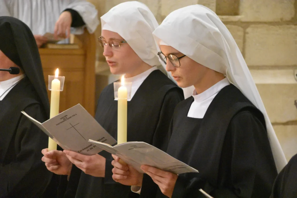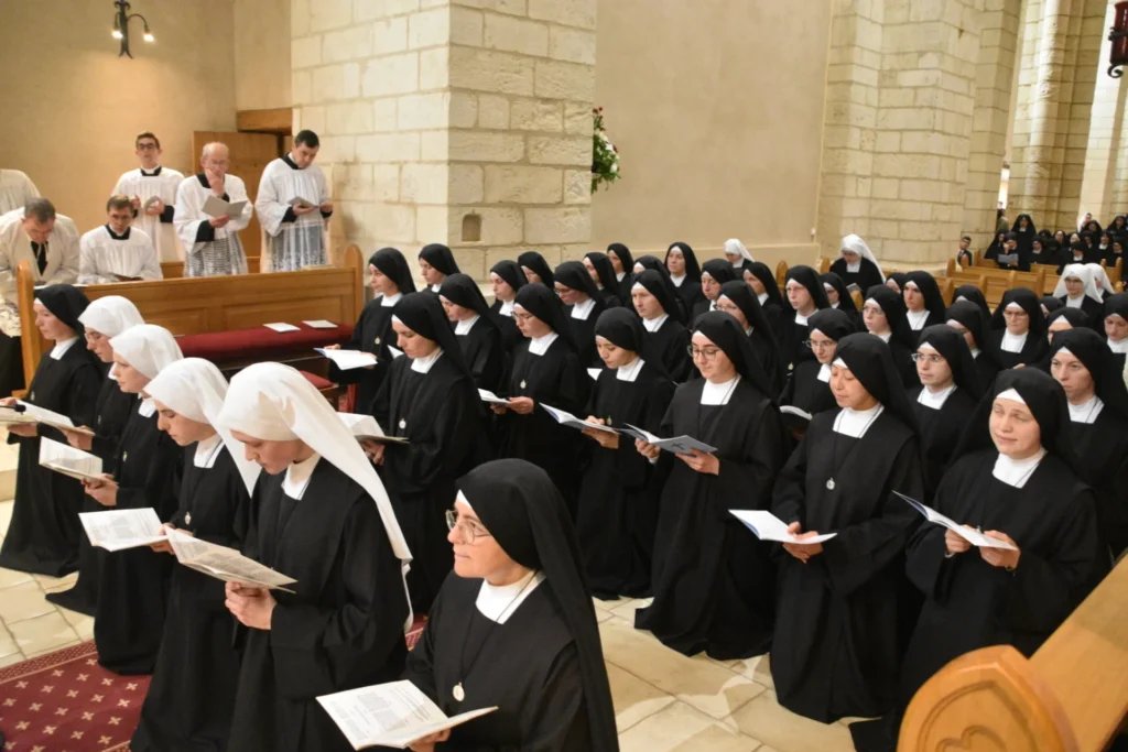 À Ruffec, 120 religieuses entourent leurs benjamines qui font leurs premiers pas dans la vie religieuse. C’est monsieur l’abbé Gonzague Peignot, supérieur du District de France, qui préside la cérémonie, entouré d’une bonne vingtaine de prêtres, frères et séminaristes.