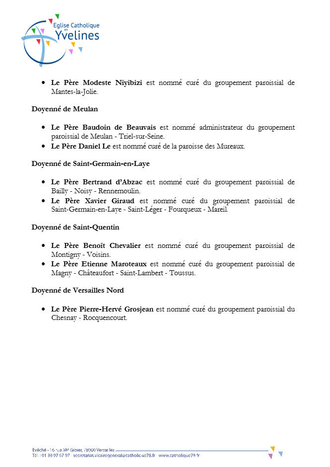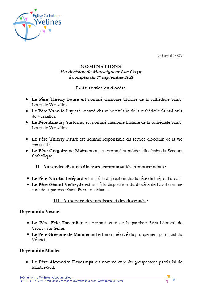 La première vague des nominations diocésaines a été publiée dans le diocèse de Versailles; outre la nomination de plusieurs chanoines à la cathédrale, elle entérine la mise à disposition d’un curé, Nicolas Lélégard, à disposition du diocèse de Toulon, et d’un autre, l’abbé Gérard Verheyde, à disposition de celui de Laval – il y sera nommé à la tête de la paroisse Saint-Pierre du Maine, 19 clochers autour de Meslay du Maine.