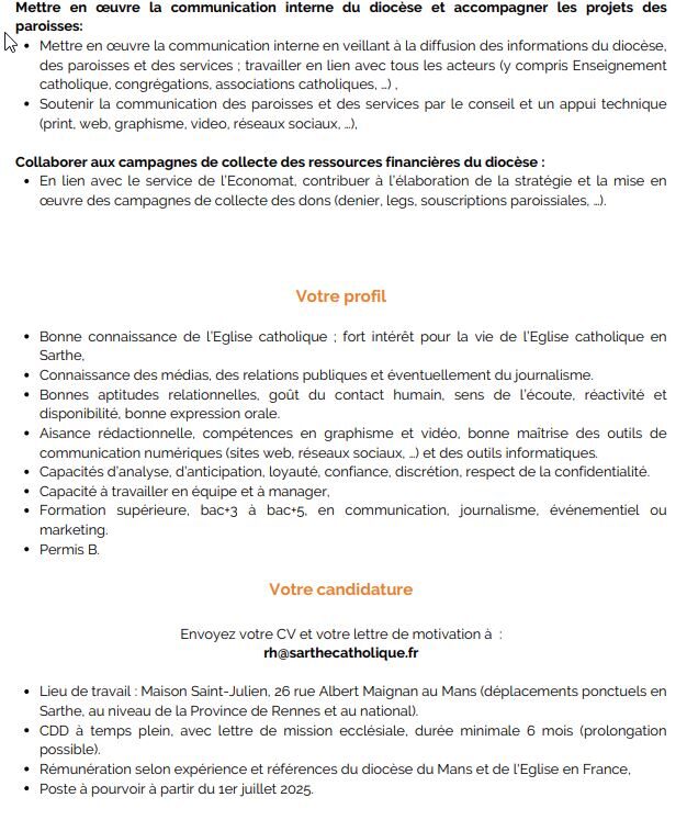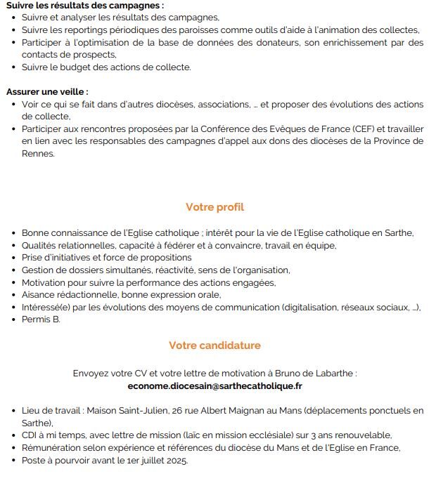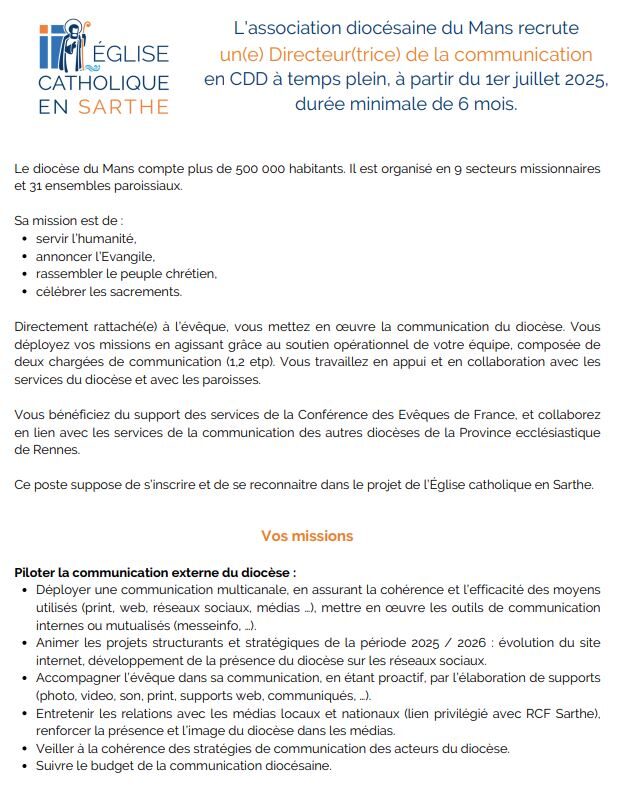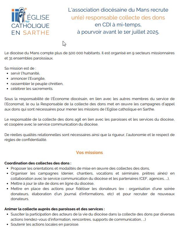 Le diocèse du Mans recherche à partir du 1er juillet un communicant en CDD pour six mois ou plus, ainsi qu’une responsable de la collecte des dons en CDI à mi-temps.
