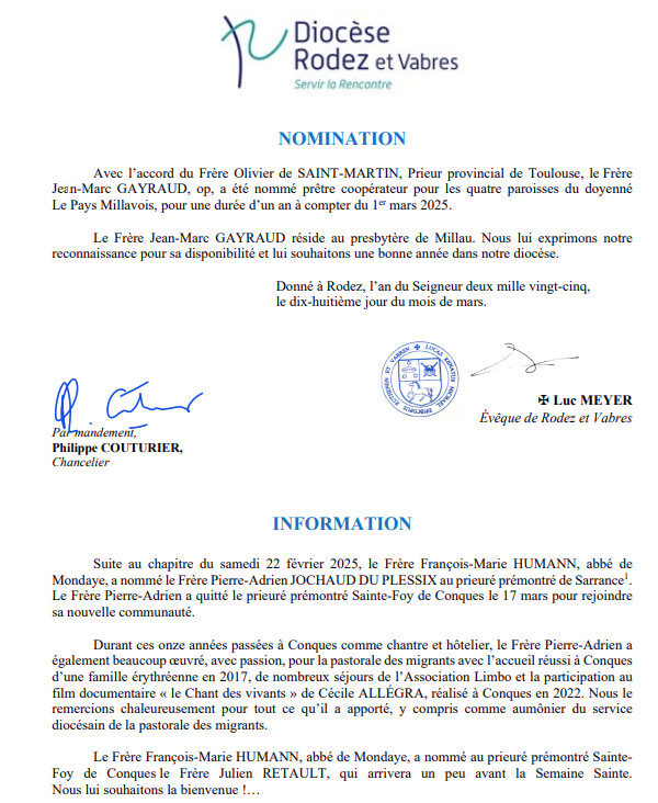 Le frère Jean-Marc Gayraud, dominicain, a été nommé prêtre coopérateur des paroisses du doyenné de Millau, où il réside pendant un an depuis mars 2025 ; les nominations font aussi état de mouvements chez les Prémontrés et notamment du départ du frère Pierre-Adrien Jochaud du Plessix de Conques vers Sarrance dans le diocèse de Bayonne; ce dernier était très engagé dans la pastorale des migrants et notamment l’accueil d’une famille d’Erythrée à Conques :