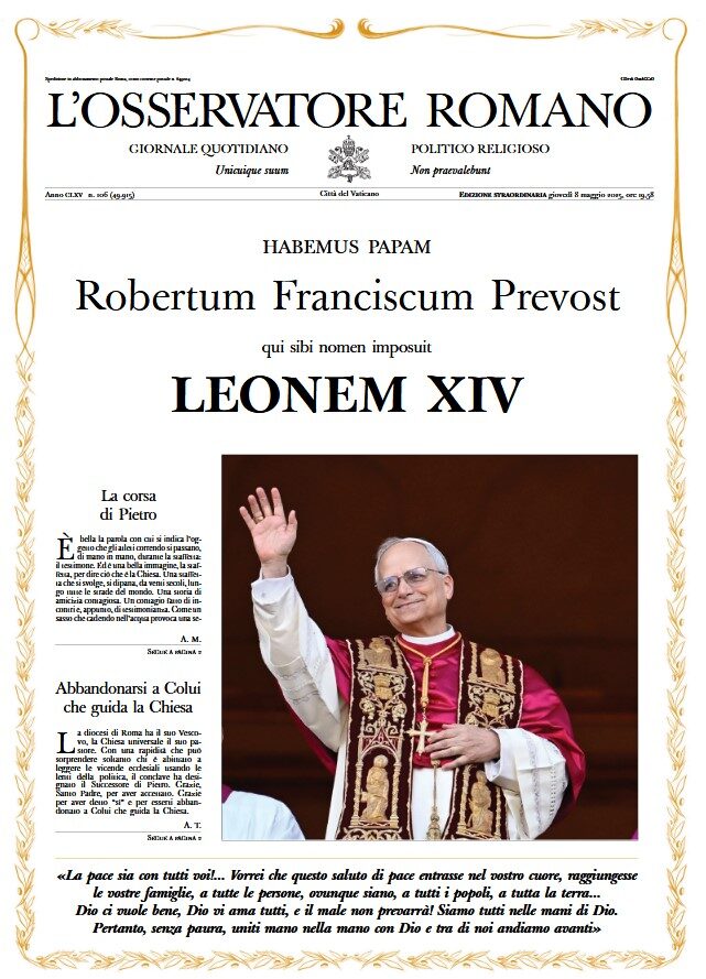 Accueil » Nos archives » La Une de L’Osservatore Romano Non classifié(e) La Une de L’Osservatore Romano L’Osservatore Romano du vendredi 9 mai Article précédentAgenda: L’Institut Croix des Vents vous invite à sa kermesse annuelle le jeudi 29 mai (Ascension) Article suivantLéon XIV n'est pas François 9 mai 2025