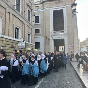 L’Institut du Christ-Roi Souverain Prêtre était en pèlerinage à Rome. Le vendredi après-midi, il a prié sur la tombe de saint Pierre aux intentions du nouveau pape. Le pèlerinage était conduit par Mgr Wach. Il y avait un grand nombre de prêtres et de séminaristes, mais aussi des religieuses de la branche féminine de l’Institut du Christ-Roi. En sortant de basilique, le pèlerinage a attiré l’attention des fidèles et des curieux. Les pèlerins se sont ensuite rendus au palais Cesi qui est tenu par les Salvatoriens.