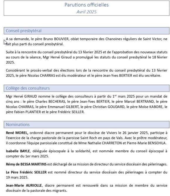 Accueil » Nos archives » Viviers : les nominations diocésaines Église en France Viviers : les nominations diocésaines Voici les nominations du diocèse de Viviers, effectives à partir du printemps – et du 1er mars pour le conseil presbytéral Article précédentConférence sur Arnaud Beltrame le 12 juin à Rambouillet Article suivant13 diacres ordonnés pour la Fraternité Saint-Pierre 31 mai 2025