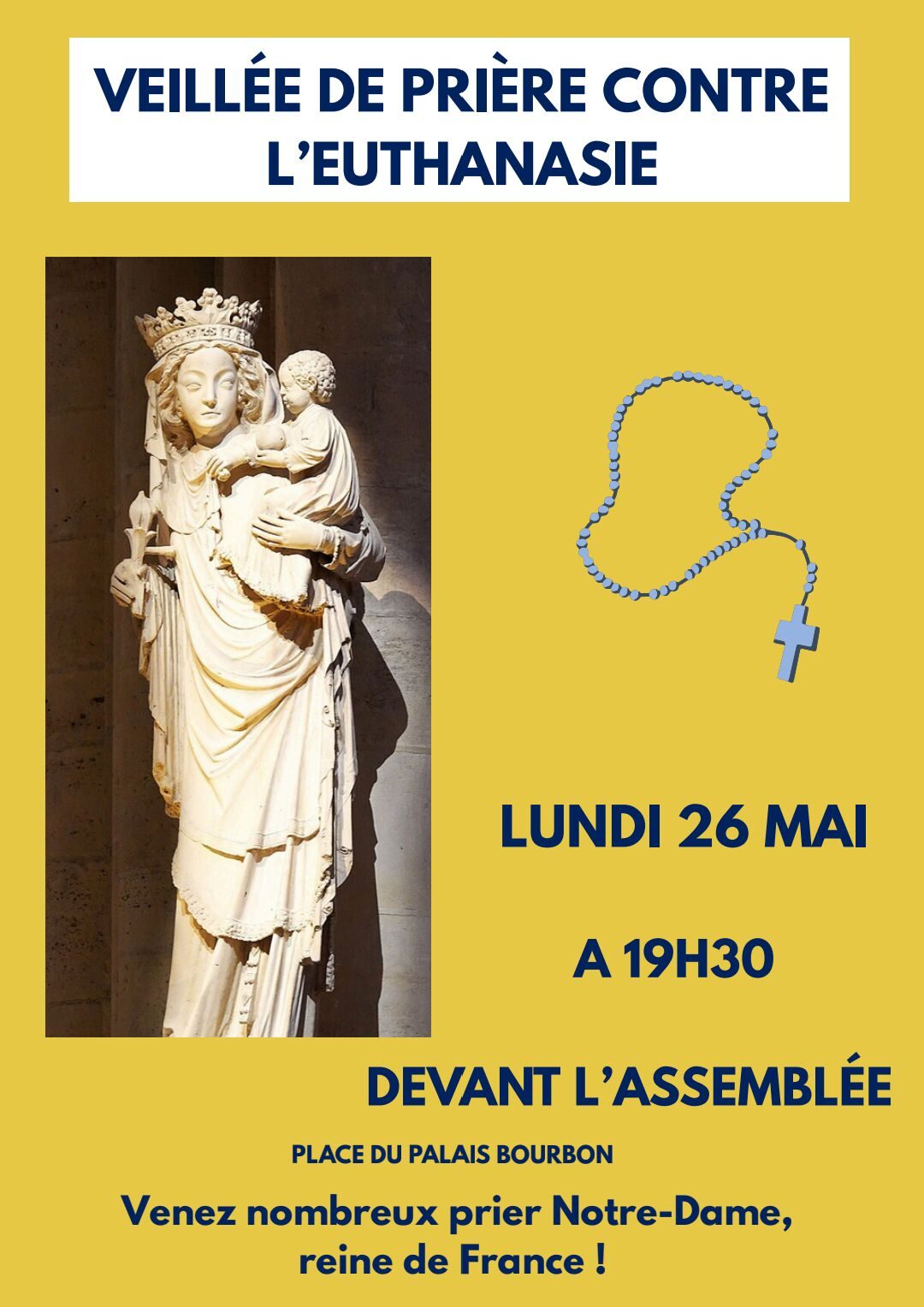 Accueil » Nos archives » Veillée de prière contre l’euthanasie ce lundi 26 mai à 18h30 devant l’Assemblée Nationale (Paris) Question de la semaine… Veillée de prière contre l’euthanasie ce lundi 26 mai à 18h30 devant l’Assemblée Nationale (Paris) On nous prie de relayer : Article précédentLa Saint Joseph à l'Institut Croix des Vents de Sées Article suivantGrenoble : une Vierge consacrée à Vienne (38) 26 mai 2025