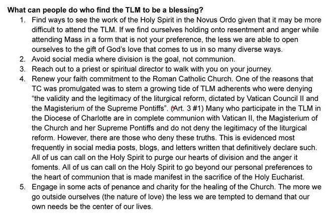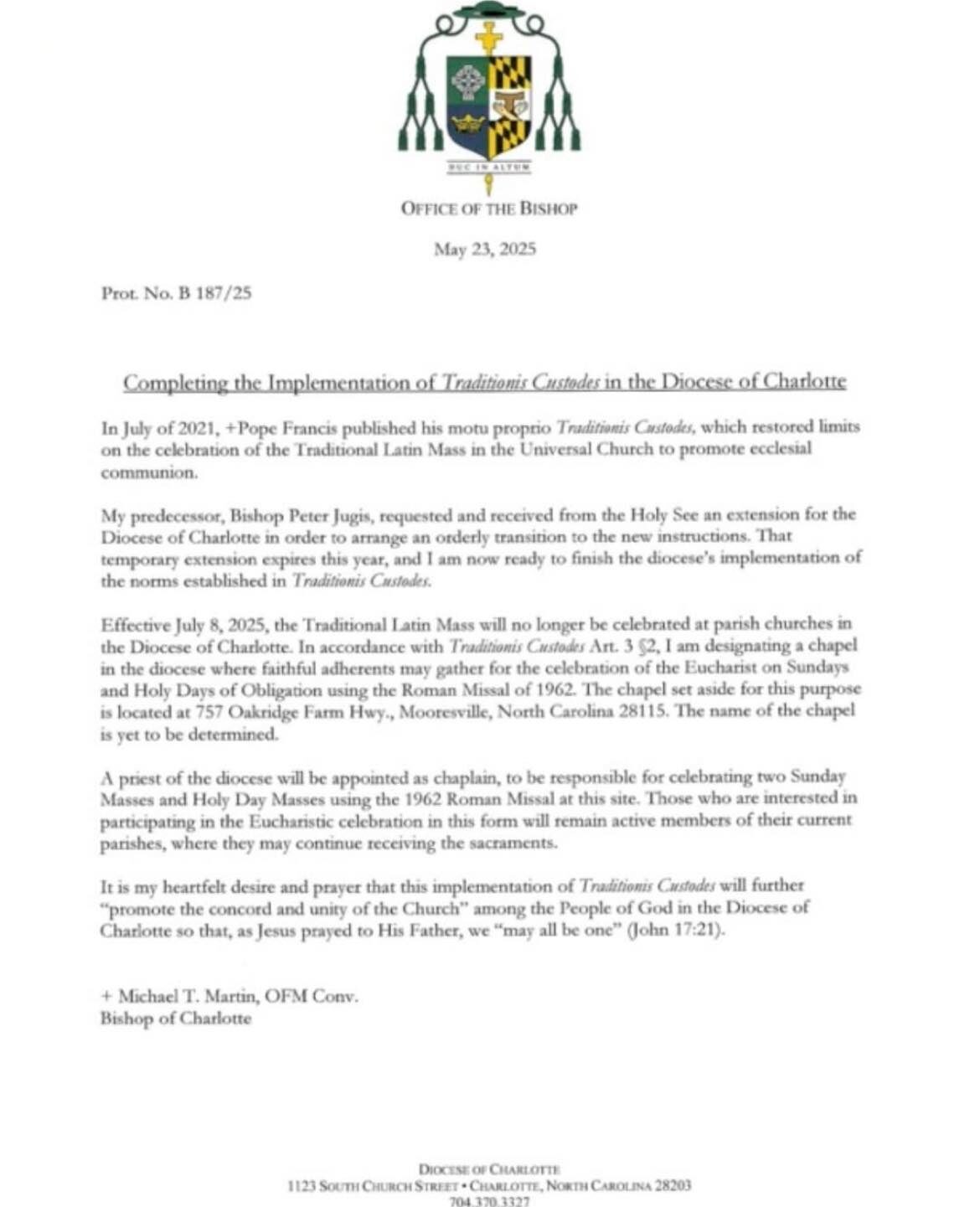 Malgré de nombreuses pétitions, lettres, réunions, Mgr Peter Jugis (évêque émérite retiré depuis 2024) avait annoncé que la messe traditionnelle (latin mass) ne serait plus célébrée après octobre 2025. Mgr Martin anticipe cette décision en supprimant les messes dominicales de l’église Sainte-Anne et Saint Thomas d’Aquin (de Charlotte), l’église Saint Jean-Baptiste de Tryon et l’église Notre-Dame de Grâce de Greesboro. Le diocèse devrait assigner une chapelle où la messe traditionnelle ne sera plus célébrée que 2 dimanches par mois (avant probablement une suppression complète).