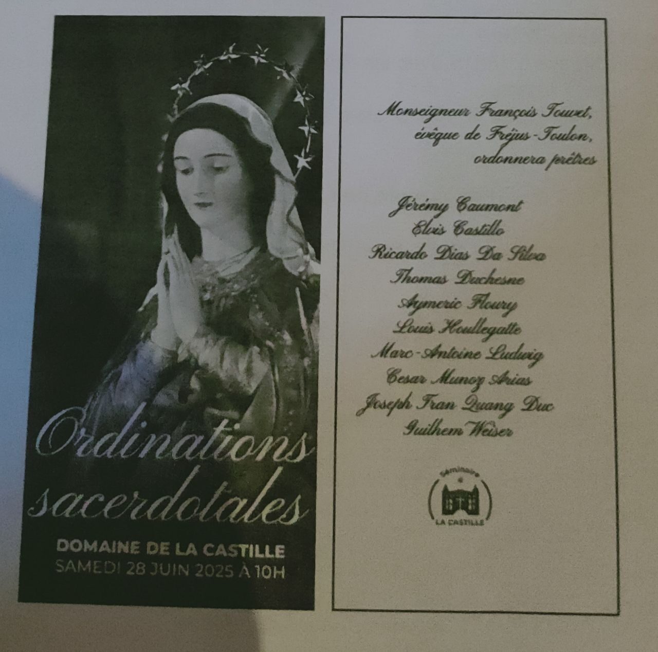 Le diocèse de Toulon a publié les invitations aux ordinations en NOM le 28 juin prochain, dix prêtres y seront ordonnés par Mgr Touvet. Par ailleurs, six ordinations des diacres des missionnaires de la Miséricorde sont toujours prévues, mais en suspens :