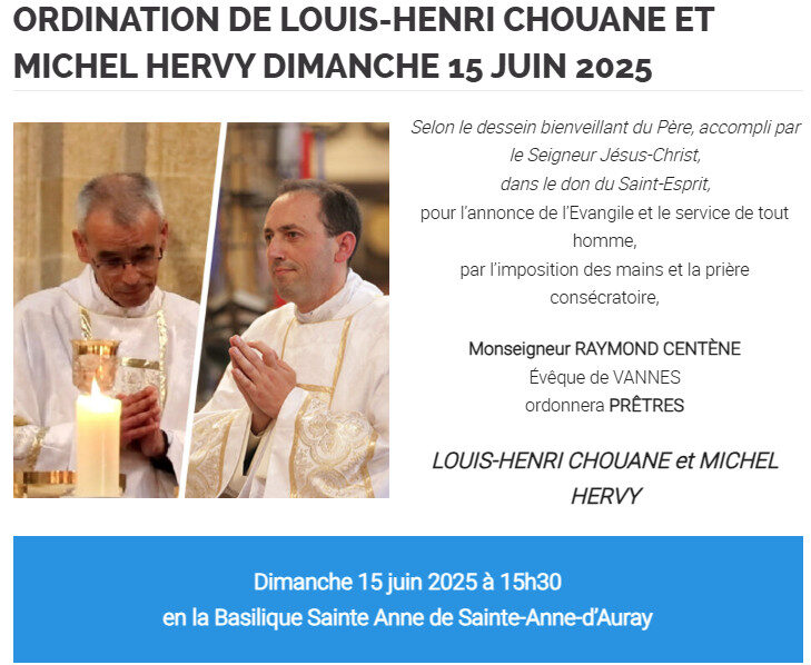 - A Vannes, Louis-Henri Chouane et Michel Hervy seront ordonnés prêtres à Sainte-Anne d’Auray le 15 juin prochain à 15h30