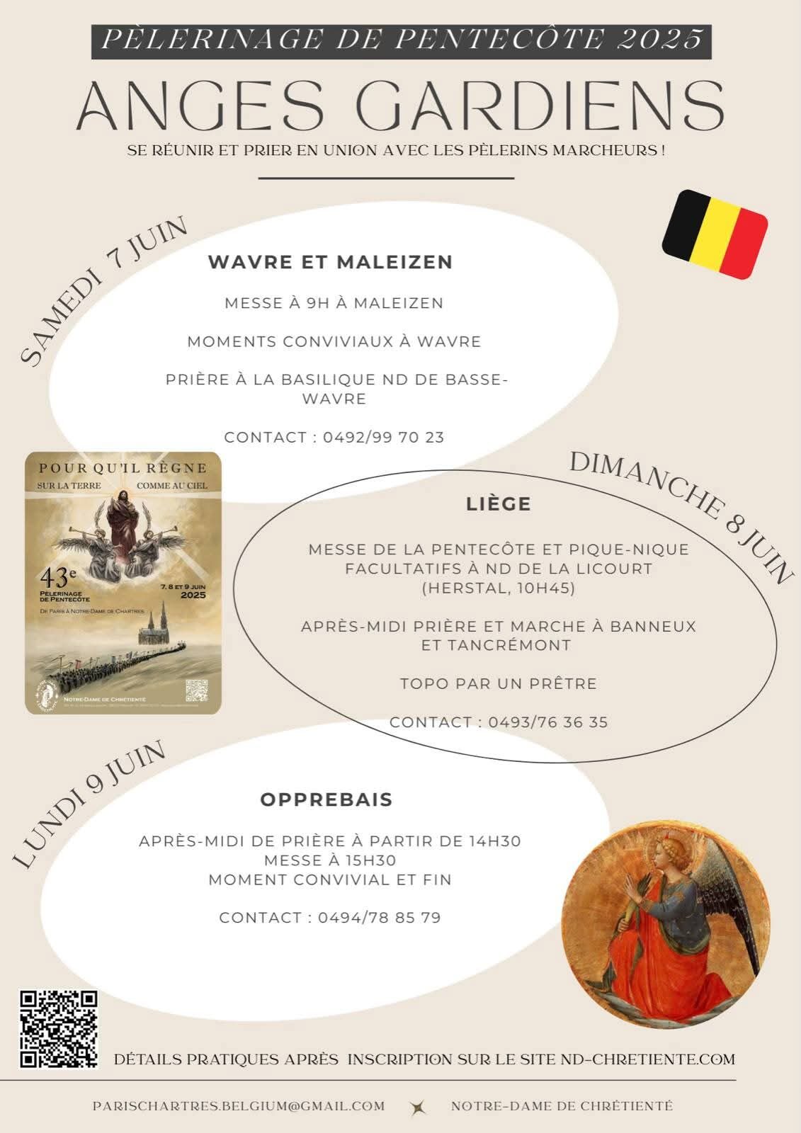 Accueil » Nos archives » Chapitres Anges Gardiens (NDC) en Belgique Summorum Pontificum Chapitres Anges Gardiens (NDC) en Belgique A l’occasion du Pèlerinage de Pentecôte, de nombreux pèlerins Anges Gardiens vont s’associer au Pèlerinage. On nous transmet les informations pour la Belgique (Wavre / Liège et Opprebais) : Article précédentA propos de la retraite des séminaristes et novices dès leur entrée en propédeutique ou spiritualité Article suivant« Entre l’Église et les tradis, à quand la désescalade ? » 6 juin 2025
