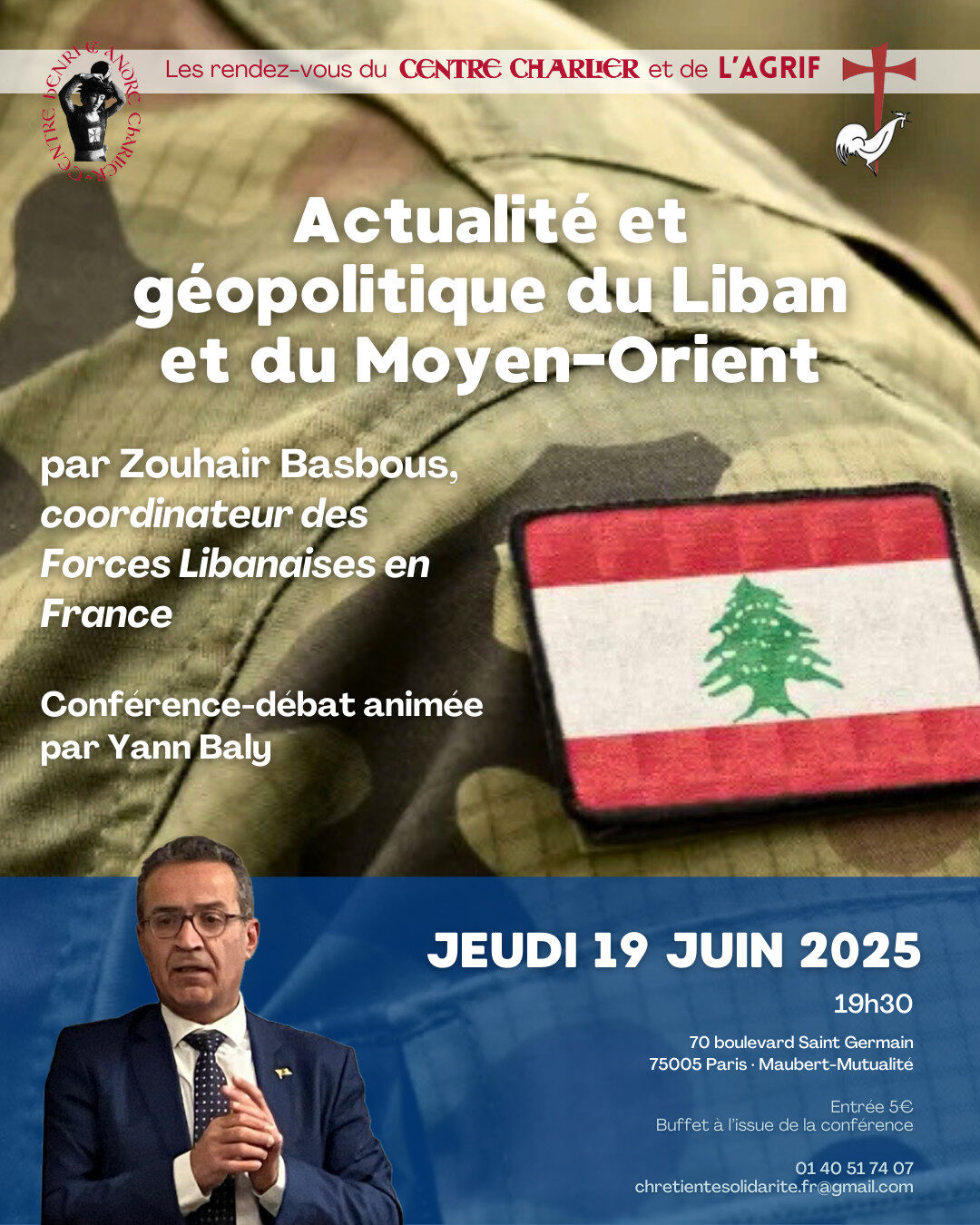 Agenda : Conférence « Actualité géopolitique du Liban et du Moyen-Orient » au Centre Charlier (Paris) le jeudi 19 juin