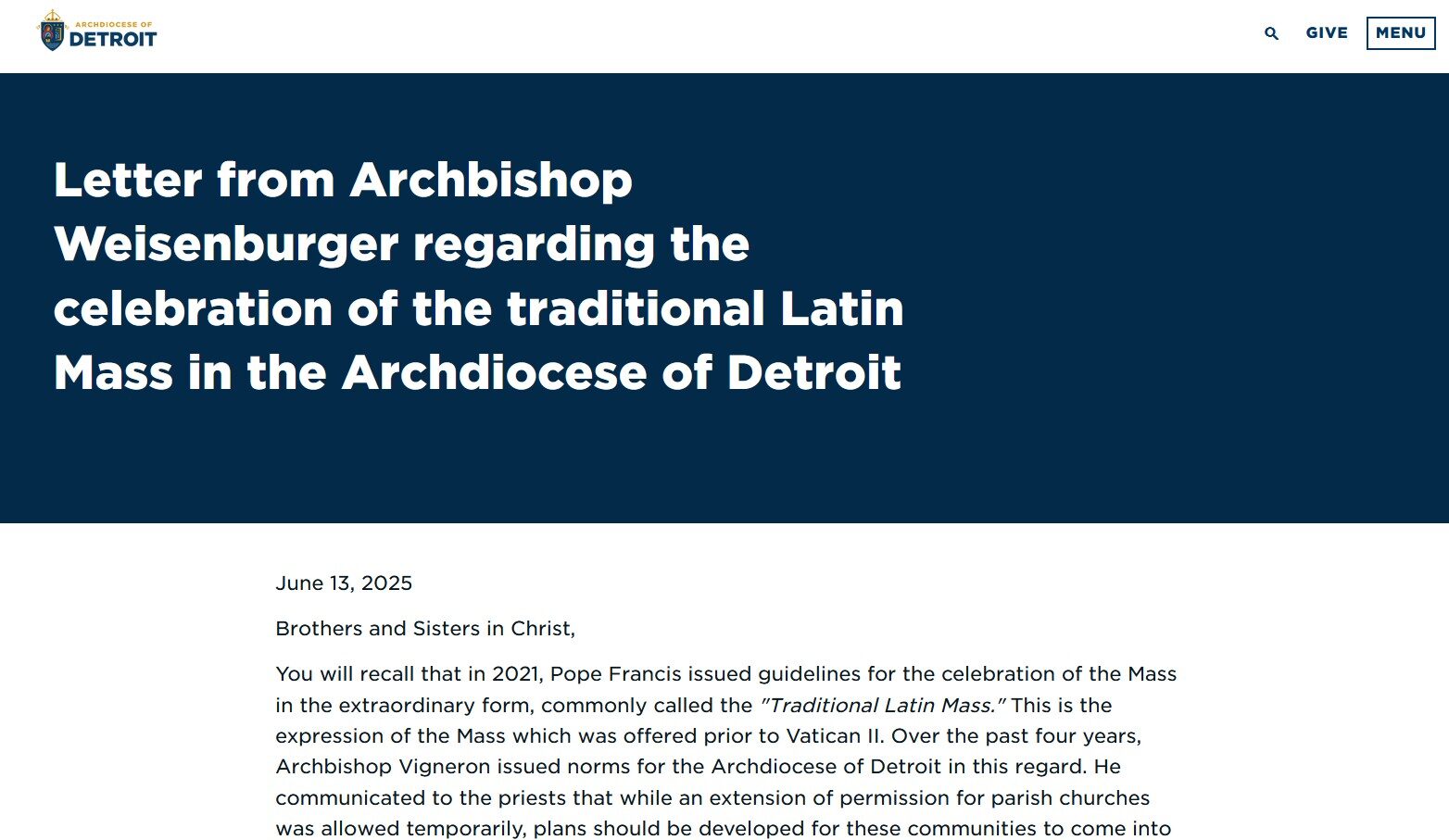 Mgr Edward Weisenburger, archevêque de Détroit, annonce de nouvelles restrictions pour les messes traditionnelles célébrées dans son diocèse. Il maintient 4 lieux répartis dans le diocèse (dont l’apostolat de l’Institut du Christ Roi à Détroit) mais en supprime 10 autres lieux. (Extrait de son communiqué ci-dessous)