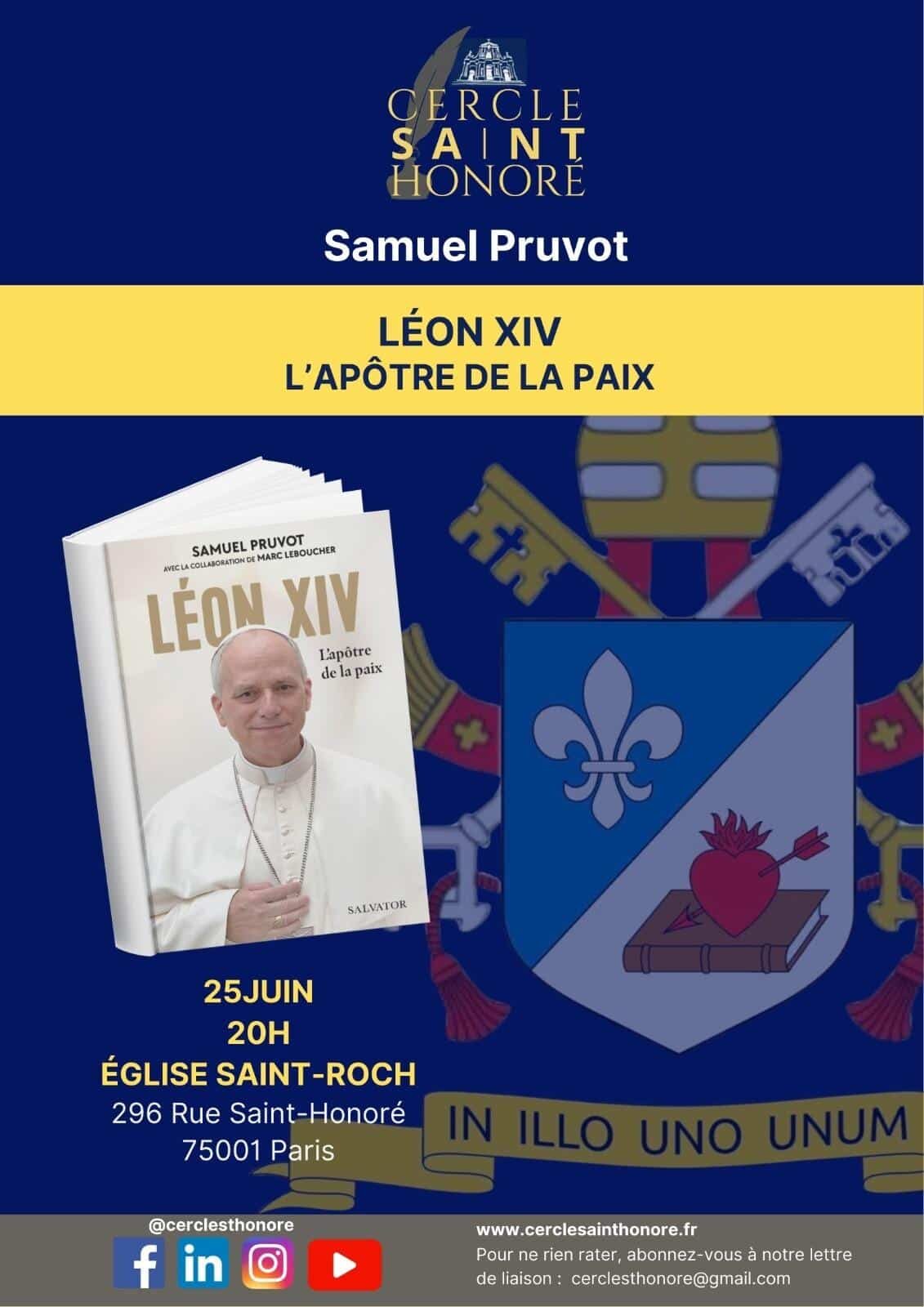 Accueil » Nos archives » Conférence de Samuel Pruvot « Léon XIV l’Apôtre de la Paix » le 25 juin Summorum Pontificum Conférence de Samuel Pruvot « Léon XIV l’Apôtre de la Paix » le 25 juin Le Cercle Saint Honoré organise une conférence de Samuel Pruvot « Léon XIV L’Apôtre de la Paix » le mercredi 25 juin à 20h00 à l’église Saint-Roch (Paris). Paroisse Saint-Roch (Paris) Article précédentL’aumônier général des Scouts et guides de France désapprouve l'élection de Marine Rosset Article suivantOrdinations : un prêtre ordonné à Beauvais et deux dans le diocèse de Soissons 21 juin 2025