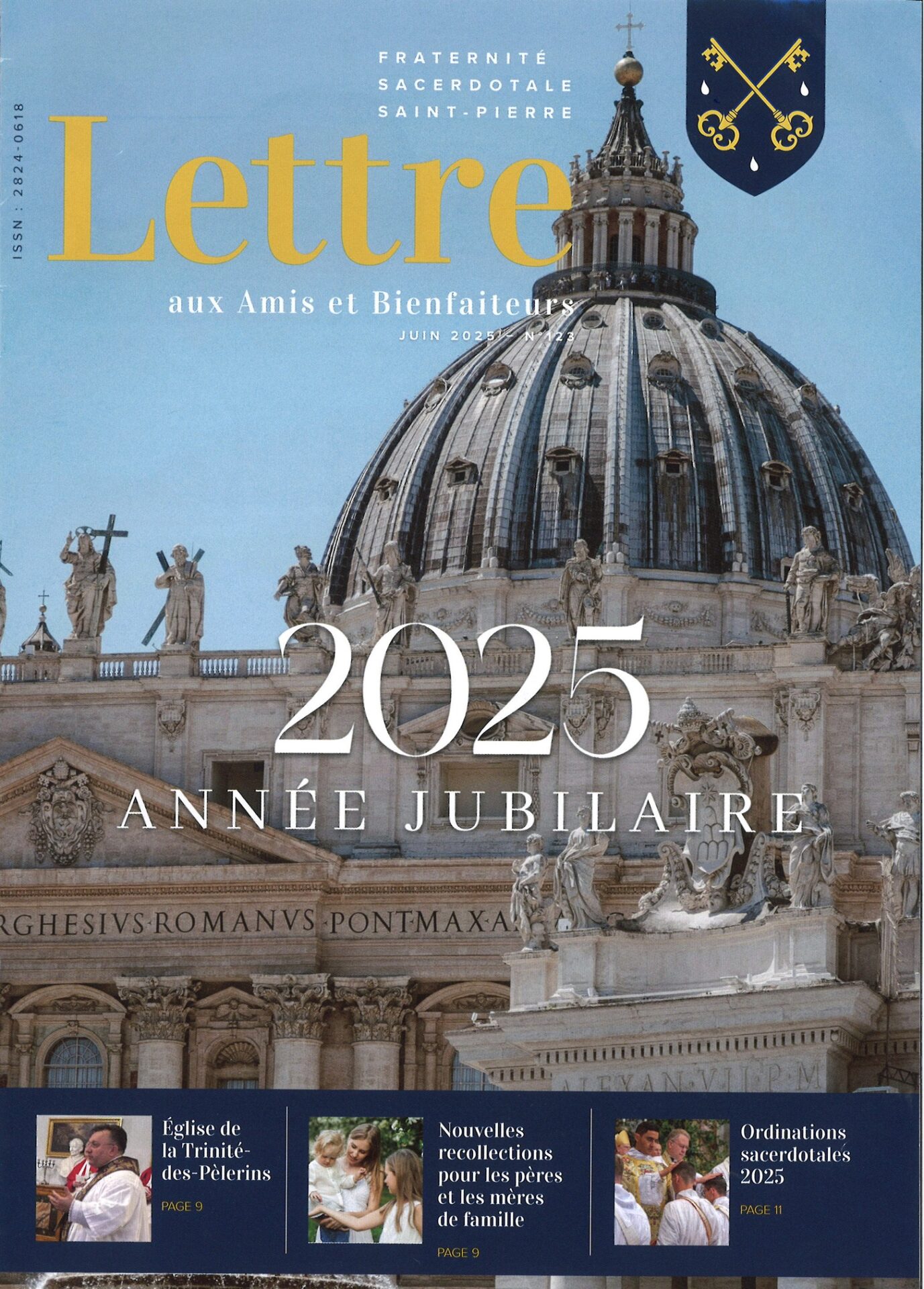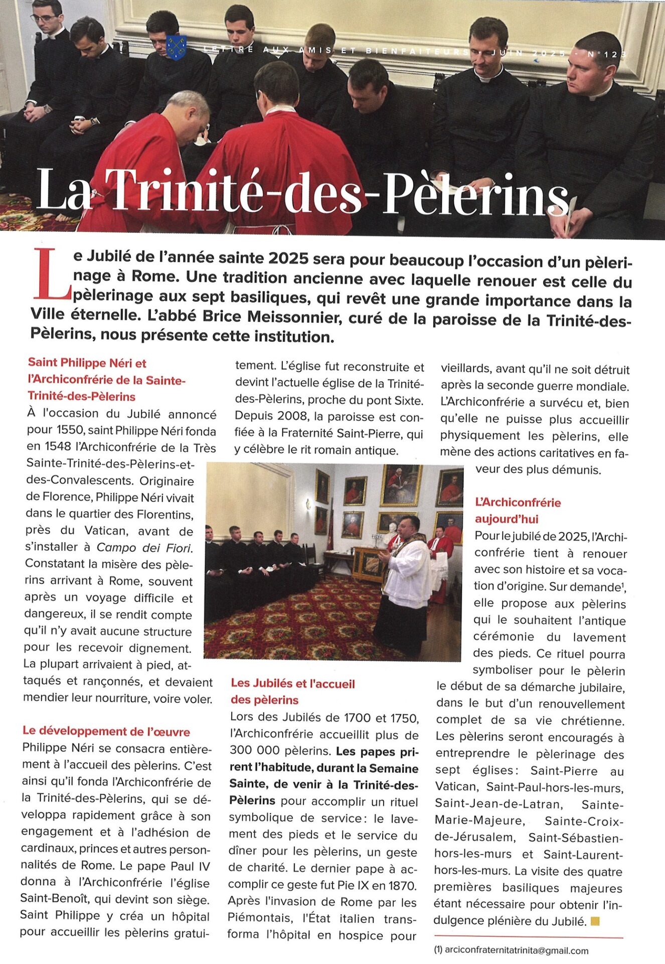 La dernière Lettre aux Amis et Bienfaiteurs de la Fraternité Saint-Pierre (Juin 2025, n°123) vient de paraître. Une grande partie de cette lettre est consacrée au Jubilé de l’Espérance dont un article (ci-dessous) sur le Pèlerinage aux 7 basiliques par l’abbé Meissonnier, curé de la paroisse personnelle de la FSSP à Rome, l’église de la Trinité des Pèlerins :