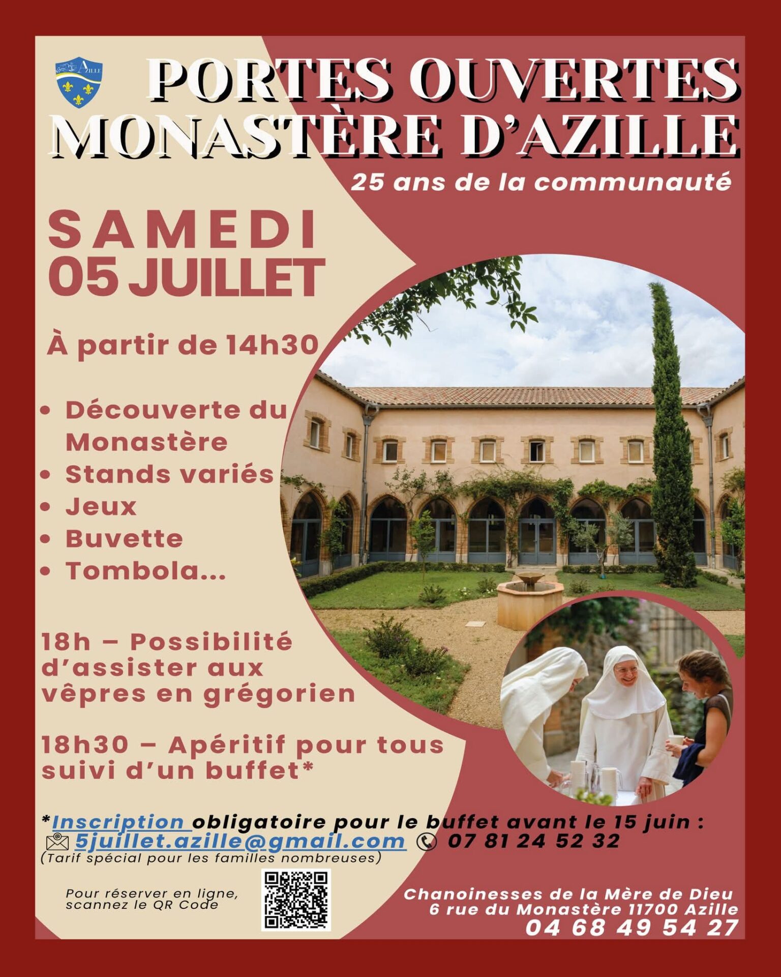 Accueil » Nos archives » Portes ouvertes au Monastère d’Azille le 5 juillet Summorum Pontificum Portes ouvertes au Monastère d’Azille le 5 juillet A l’occasion des 25 ans de la communauté, les Chanoinesses de la Mère de Dieu ouvrent leur portes le temps d’une journée : Chanoinesses d’Azille Article précédent[Photos] Ordinations sacerdotales à la Fraternité Saint-Pierre à Wigratzbad Article suivantParcours spirituel d'été : en vacances avec Dieu ! 29 juin 2025