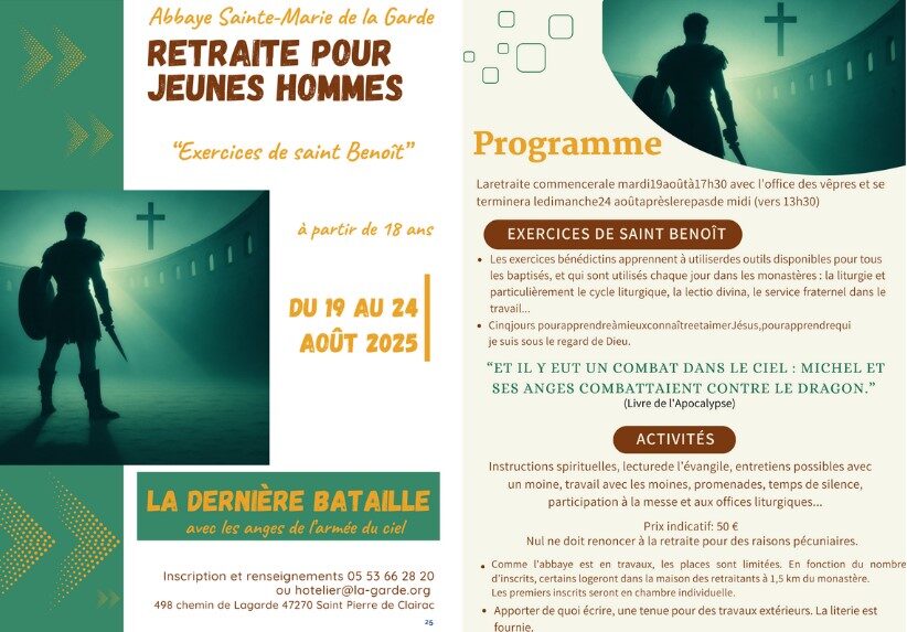 Accueil » Nos archives » Retraite pour hommes à l’abbaye de la Garde (47) en août Summorum Pontificum Retraite pour hommes à l’abbaye de la Garde (47) en août L’abbaye Sainte Marie de la Garde propose une retraite spirituelle pour hommes à partir de 18 ans du 19 au 24 août 2025 : Abbaye Sainte-Marie de la Garde Article précédentTué en pleine messe en 1938 : le père Stanislaw Streich béatifié en Pologne Article suivantDiocèse de Toulouse : le nouveau chancelier a été condamné pour viols sur mineur 3 juillet 2025
