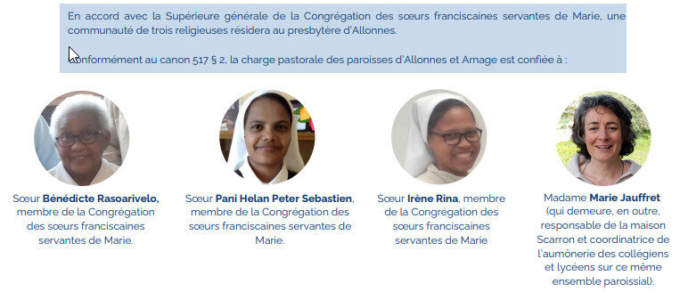 Par ailleurs une communauté de trois soeurs Franciscaines servantes de Marie résidera au presbytère d’Allonnes, en banlieue du Mans :