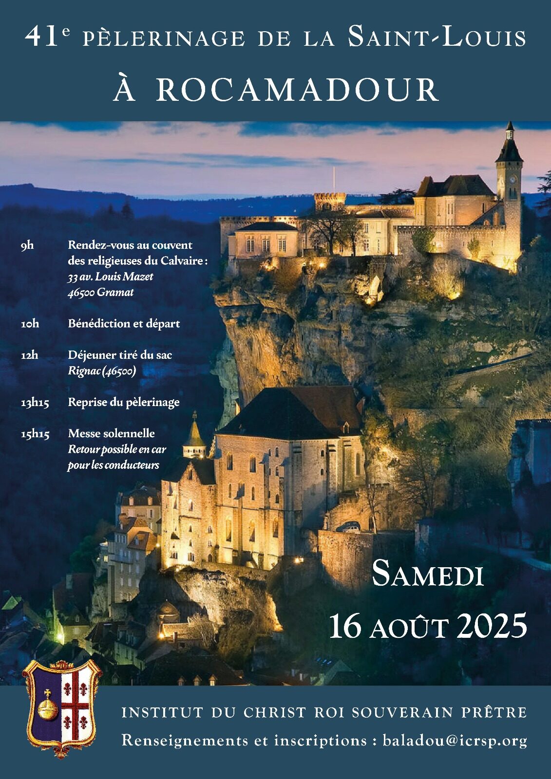 41è Pèlerinage de la Saint-Louis à Rocamadour accompagné par l’Institut du Christ Roi le samedi 16 août. L’aumônerie est assurée par des prêtres et séminaristes de l’Institut du Christ Roi.