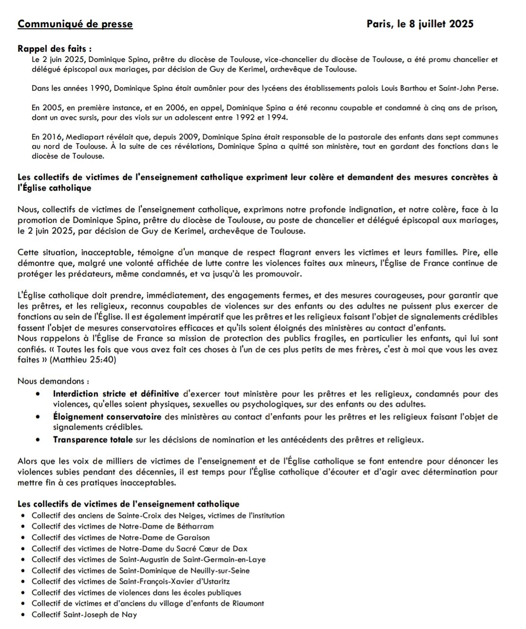 Un communiqué de presse signé par plusieurs collectifs de victimes d’établissements scolaires religieux (dont Ustarritz, Betharram, Dax, Riaumont, Sainte-Croix des Neiges etc) s’insurge de la nomination de l’abbé Spina malgré son passif et demande à l’Eglise catholique des mesures franches et nettes, notamment « l’interdiction stricte et définitive d’exercer tout ministère pour les prêtres et les religieux condamnés pour des violences, qu’elles soient physiques, sexuelles ou psychologiques, sur des enfants ou des adultes« .