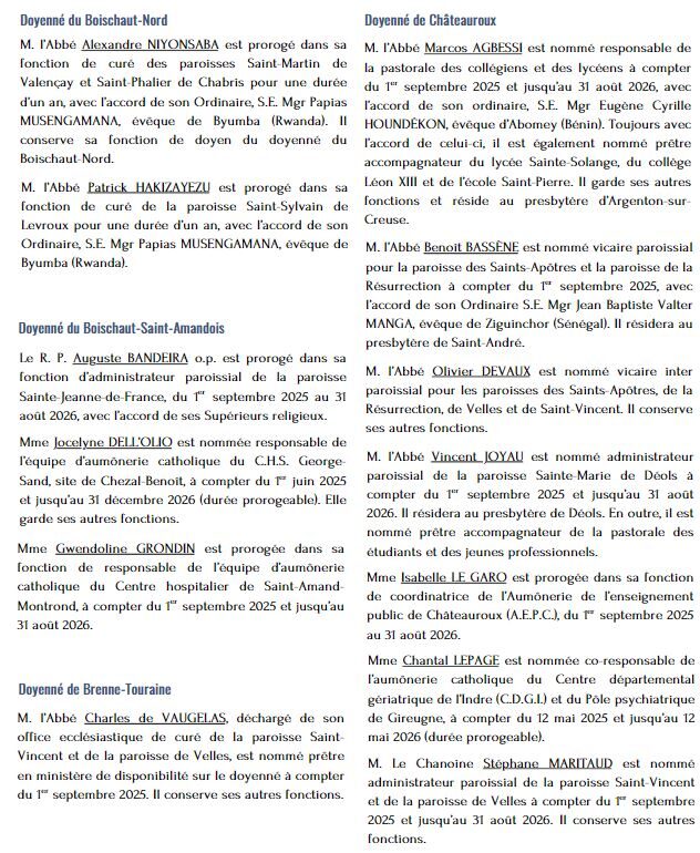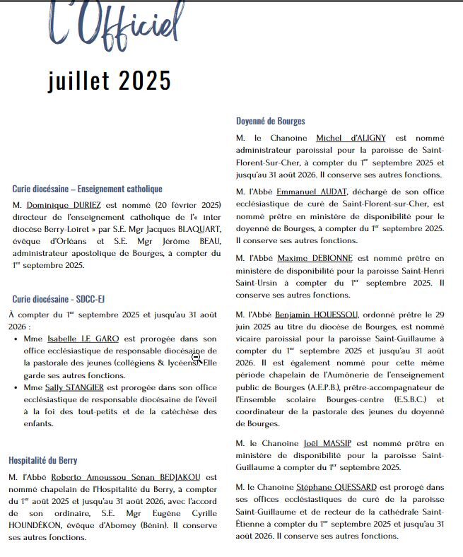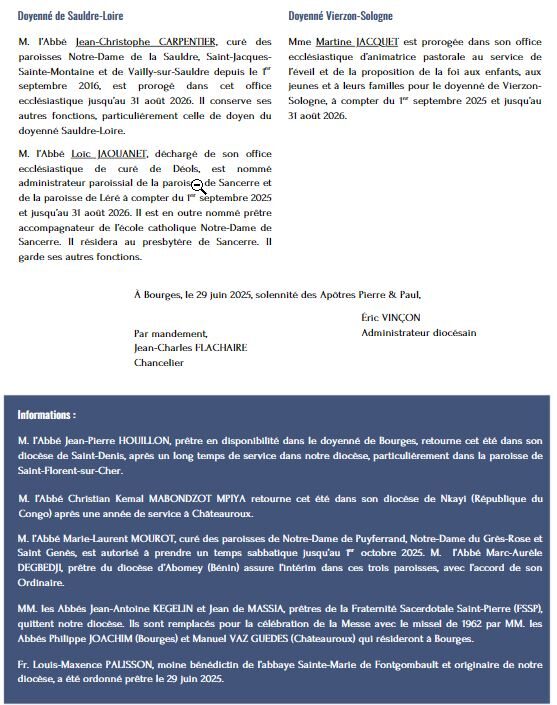 Voici les nominations diocésaines du diocèse de Bourges, actuellement vacant, signées par l’administrateur diocésain le père Vinçon.