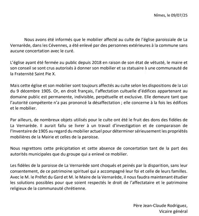 Le diocèse de Nîmes communique après le pillage de l’église de la Vernarède le 5 juillet dernier par le prieur de la FSSPX d’Avignon et une dizaine de ses fidèles; le reportage du 19/20 de France 3 paru le 10 juillet dernier montre l’église dépouillée de ses statues, d’un autel, de sa chaire, des boiseries et des stations du chemin de croix ont été déposées, il y a des trous dans le sol. Selon des témoins locaux, « équipés de perforateurs et de scies, ils ont aussi scié les barrières de communion en fer forgé et démonté des éléments fixes ».