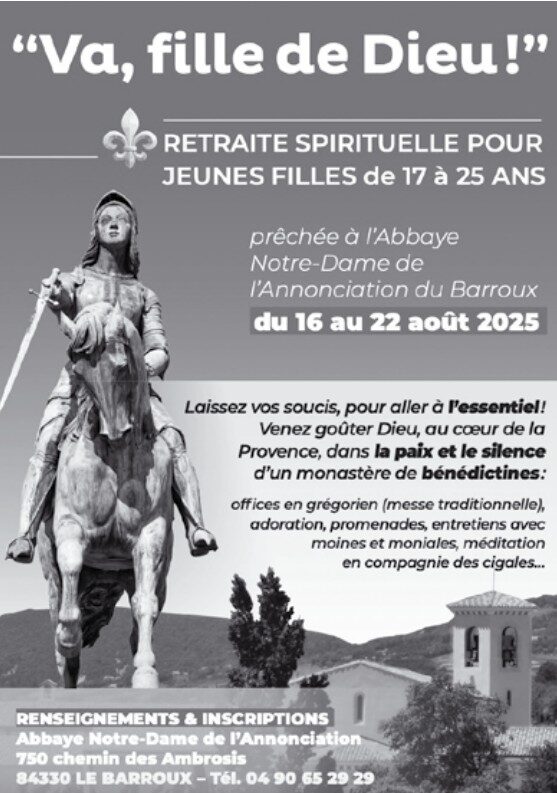 Comme chaque année en fin d’été, une retraite spirituelle pour jeunes filles de 17 à 25 ans est prêchée à l’Abbaye Notre-Dame de l’Annonciation du Barroux du 16 au 22 août 2025 : Conférences, offices en grégorien (messe traditionnelle), promenades, entretiens avec moines et moniales…