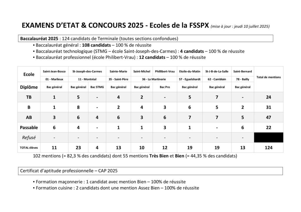 La Porte Latine publie les résultats du Bac dans les écoles de la FSSPX, avec 82% des candidats qui ont eu des mentions (102), dont 55 mentions très bien et bien.