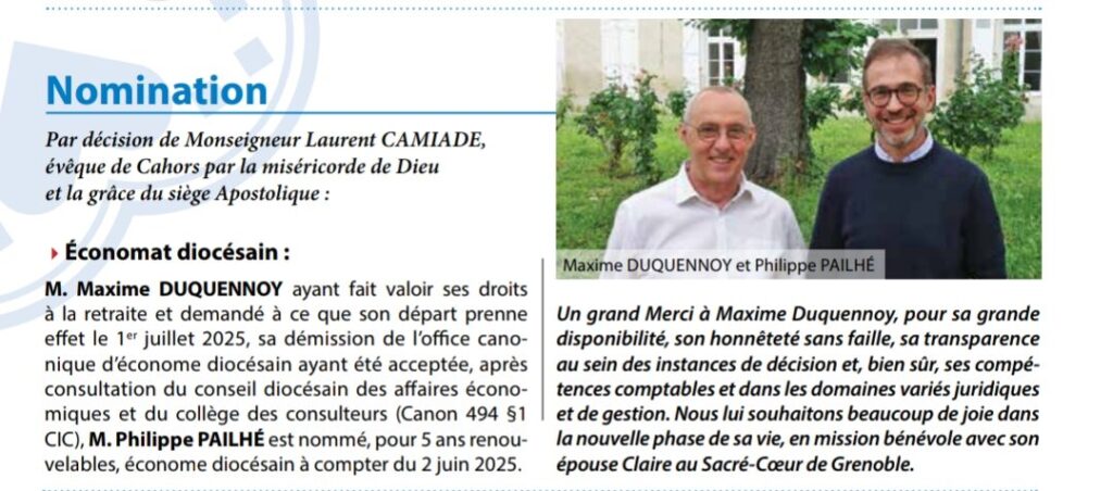 Accueil » Nos archives » Cahors : nouvel économe diocesain Diocèses Cahors : nouvel économe diocesain Le bulletin du diocèse de Cahors annonce l’arrivée d’un nouvel économe, nommé à partir du 2 juin dernier pour cinq ans renouvelables, Philippe Pailhé. Article précédentEmission de Terres de Mission (n°421, 20 juillet 2025) Article suivantAffaire Spina : Miséricorde magazine se paie Mgr de Kerimel 21 juillet 2025