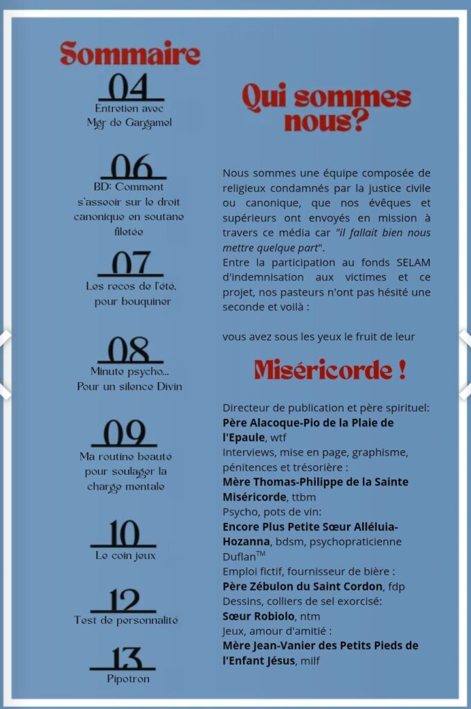Le premier numéro – dont le titre fait référence aux paroles de Mgr de Kerimel, « je prends le parti de la miséricorde » pour faire d’un curé abuseur le successeur d’un chancelier pas franchement atteint par la limite d’âge – est sorti ce lundi matin. Sa devise pourrait être castigat ridendo mores.