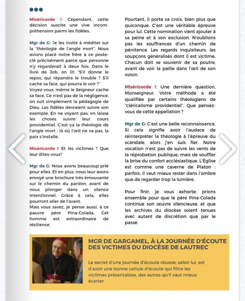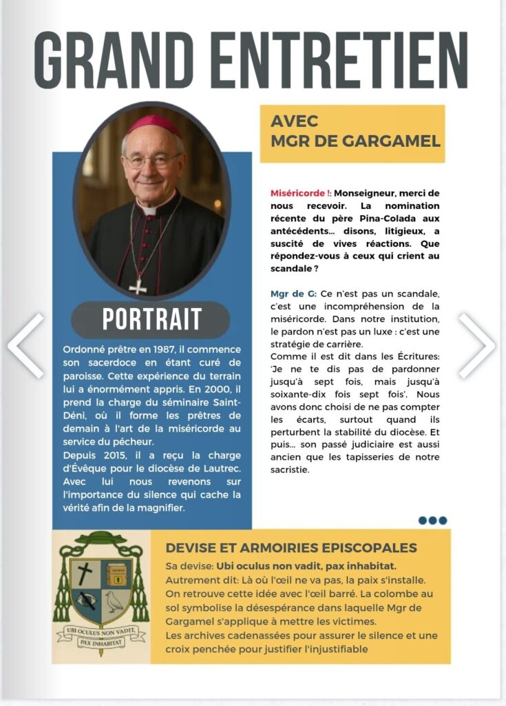 Les piteuses justifications de l’injustifiable – la nomination par Mgr de Kerimel de l’abbé Spina, condamné à de la prison ferme pour viol d’un adolescent dans les années 1990, comme chancelier du diocèse de Toulouse, ont inspiré une équipe de dessinateurs chrétiens qui ont taillé l’évêque de Toulouse (Lautrec) dans les dessins enjoués d’un « Miséricorde magazine », avec une interview presque imaginaire de l’intéressé, enfin Mgr Gargamel. Dont même les armoiries episcopales et la devise ont été revues. A lire les yeux fermés et archives diocésaines verrouillées.
