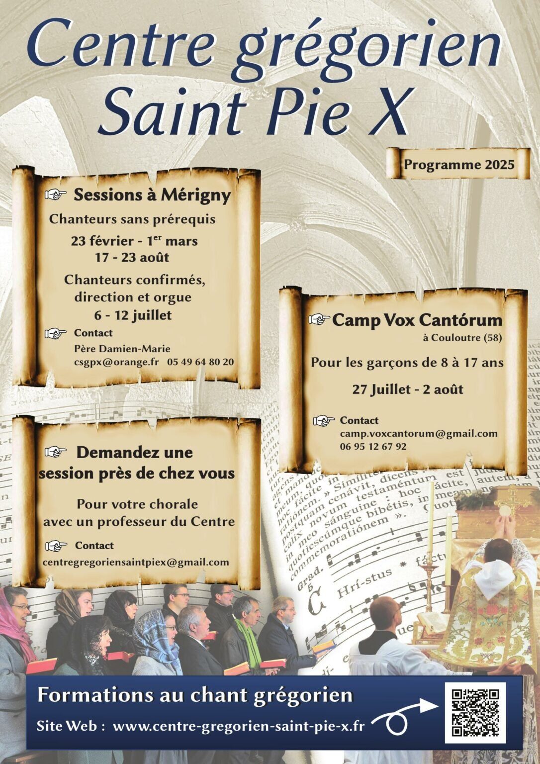 Accueil » Nos archives » [Agenda] Session de chant grégorien à Mérigny en août 2025 Summorum Pontificum [Agenda] Session de chant grégorien à Mérigny en août 2025 Du 17 au 23 août, session de chant grégorien à Mérigny par le Centre Grégorien Saint-Pie‑X pour débutants et confirmés. Renseignements et inscriptions Article précédentConcerts des chanteurs de Fra Angelico en Vendée les 25, 26 et 27 juillet Article suivant[Vidéo] Peut-on évangéliser par la politique ? 21 juillet 2025