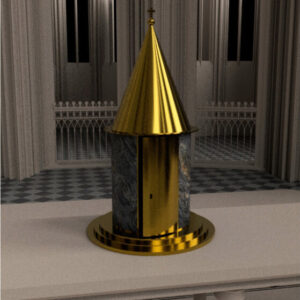 - le tabernacle sera placé tout au fond du choeur, sur l’ancien autel en pierre; « La forme du tabernacle, sorte de Tempietto sur emmarchement miniature, est inspirée des tours eucharistiques. Son plan circulaire fait écho aux fonts-baptismaux. Cette forme en tour eucharistique renoue avec le tabernacle tel qu’il était au XVIIIe ».