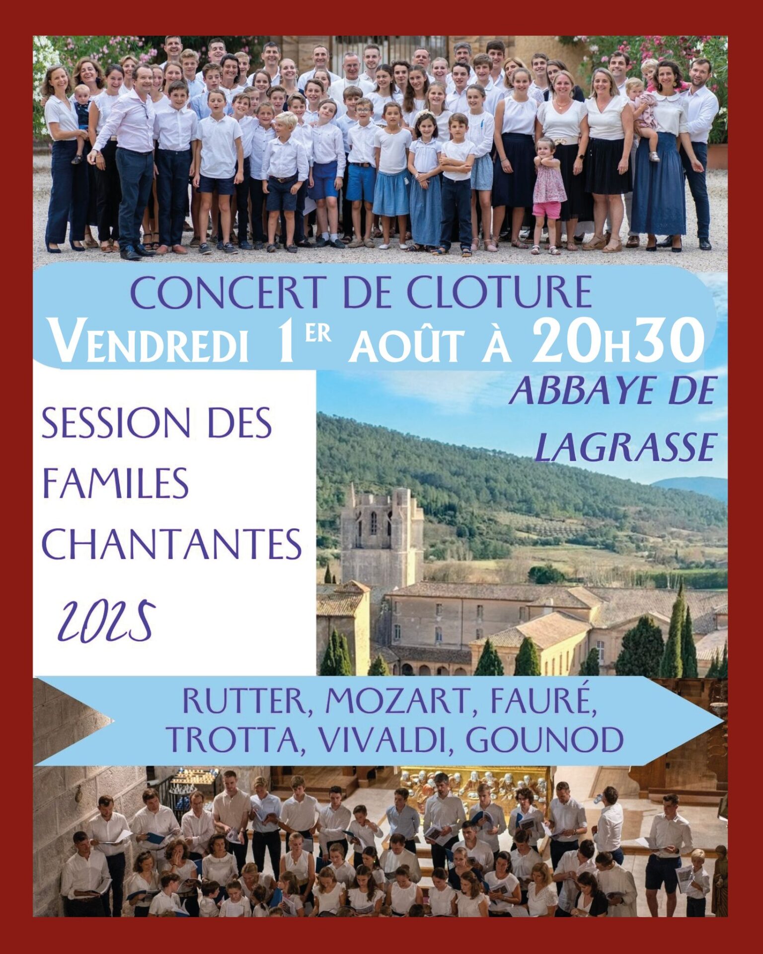 Accueil » Nos archives » Concert de la Session des Familles chantantes à Lagrasse ce 1er août Summorum Pontificum Concert de la Session des Familles chantantes à Lagrasse ce 1er août Comme les années passées, ce vendredi 1er août à 20h30 aura lieu le concert de clôture de la Session des familles chantantes en l’abbaye Sainte-Marie de Lagrasse. Abbaye de Lagrasse (Facebook) Article précédent"La croix n'est pas juste un symbole, elle est un repère, une boussole dans la nuit" Article suivantDernier numéro de la revue Una Voce (n°352, Juin, Juillet et Août 2025) 30 juillet 2025